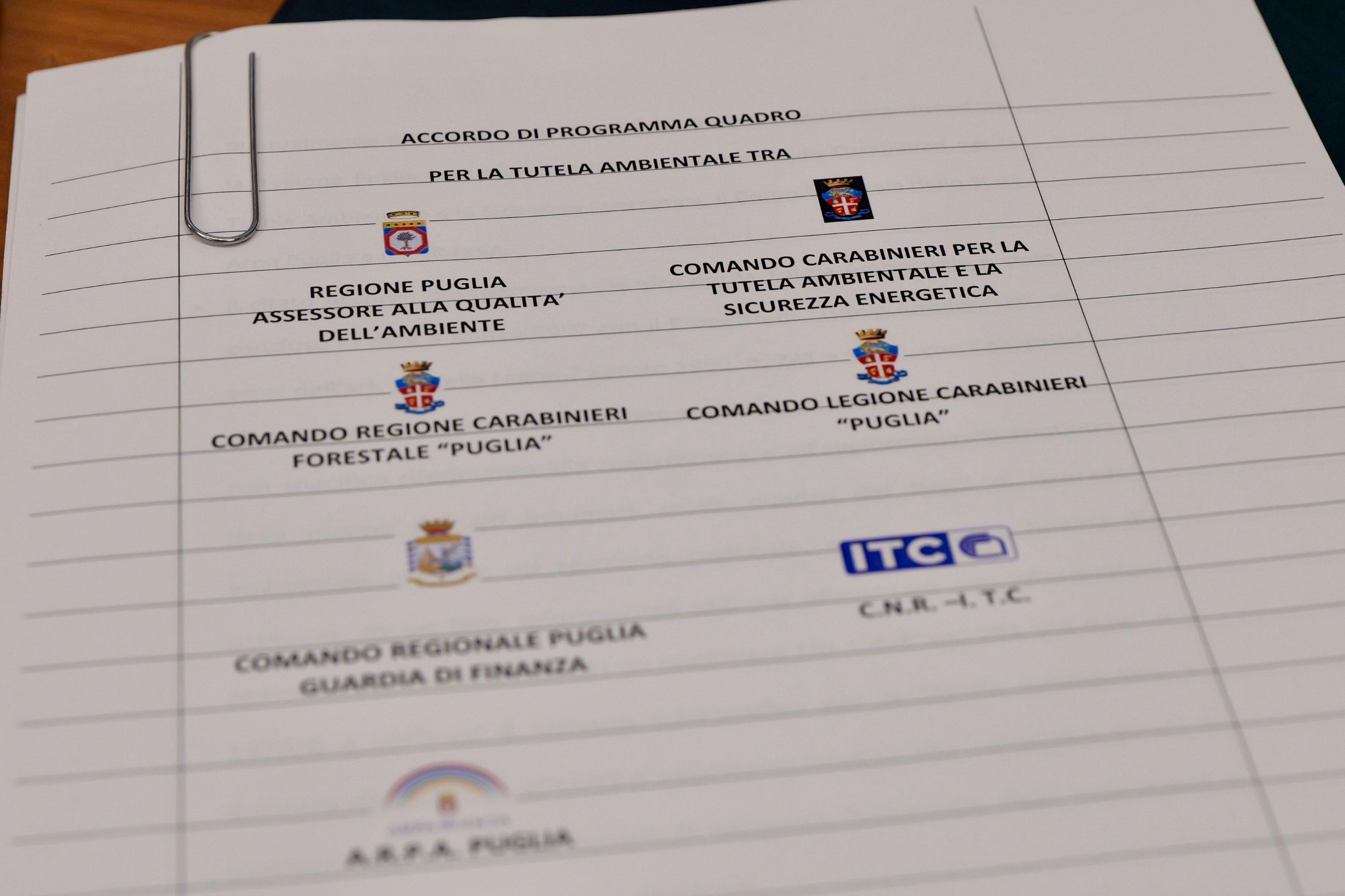 Il presidente Regione Puglia, Michele Emiliano, e l’assessora all’Ambiente, Serena Triggiani, hanno, difatti, presentato questa mattina l'accordo insieme ai co-firmatari: il comandante regionale Puglia della Guardia di Finanza, Gen. D. Guido Mario Geremia, il comandante della Legione Carabinieri, Gen. B. Ubaldo Del Monaco, il vice comandante del Comando tutela ambientale, Col. Nicola Candido, il comandante dei Carabinieri forestali, Gen. B. Angelo Vita, il direttore generale di Arpa Puglia, Vito Bruno, e il direttore del CNR-ITC, Massimo Clemente.