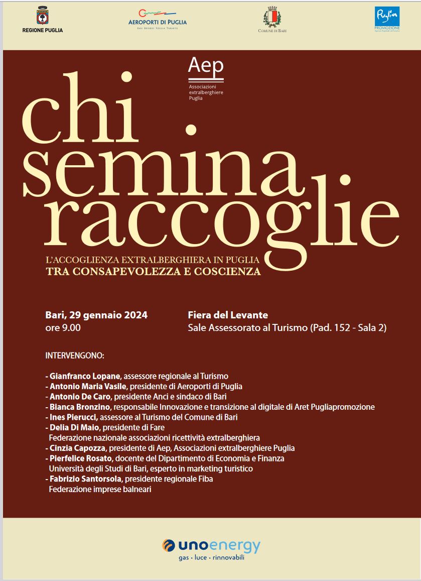 Si terrà a Bari il 29 gennaio, nelle sale dell’Assessorato al Turismo in Fiera del Levante (Padiglione 152 sala 2 ore 9), il convegno “Chi semina raccoglie, l’accoglienza extralberghiera in Puglia tra consapevolezza e coscienza”, promosso da Aep-Associazioni extralberghiere di Puglia.