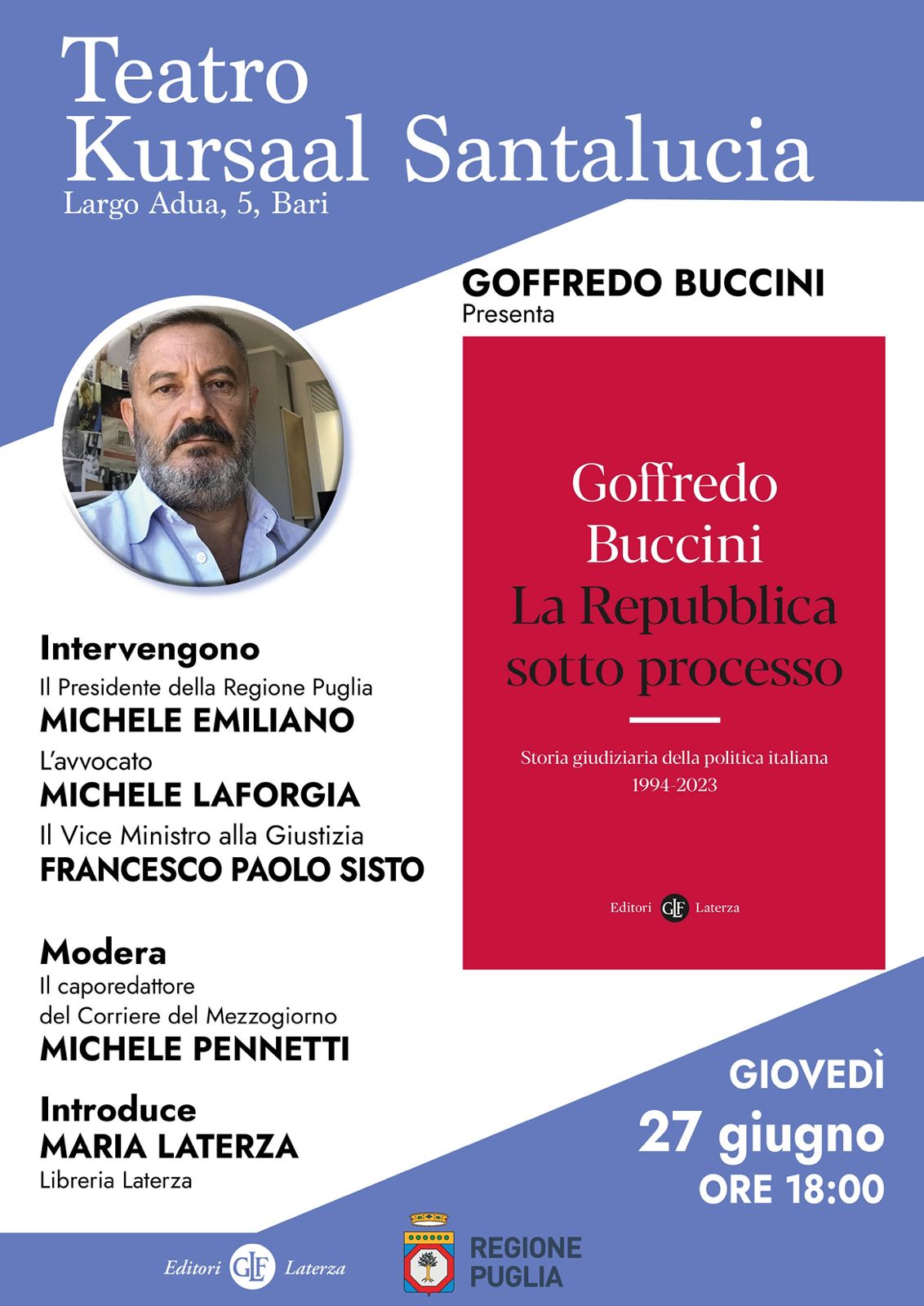 Giovedì 27 giugno, alle ore 18.00, nel teatro “Kursaal Santalucia” di Bari (l.go Adua 5 - Lungomare) l’autore Goffredo Buccini, giornalista del Corriere della Sera, presenterà il volume “La Repubblica sotto processo – storia giudiziaria della politica italiana 1994-2023” (Editori Laterza).