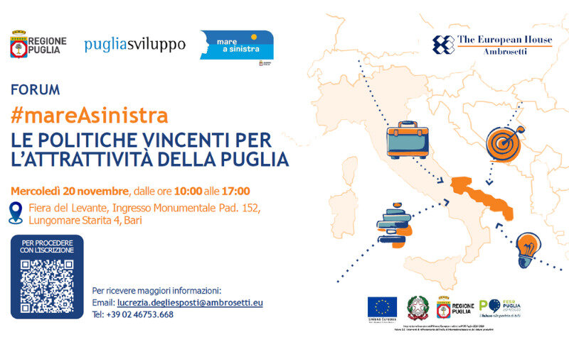 Domani mercoledì 20 novembre, dalle 10.00 alle 17.00, nel padiglione della Regione Puglia (152) della Fiera del Levante di Bari (ingresso Monumentale), si terrà il forum “#mareAsinistra, le politiche vincenti per l’attrattività della Regione Puglia”, organizzato dalla Regione, da Puglia Sviluppo e da The European House - Ambrosetti.
