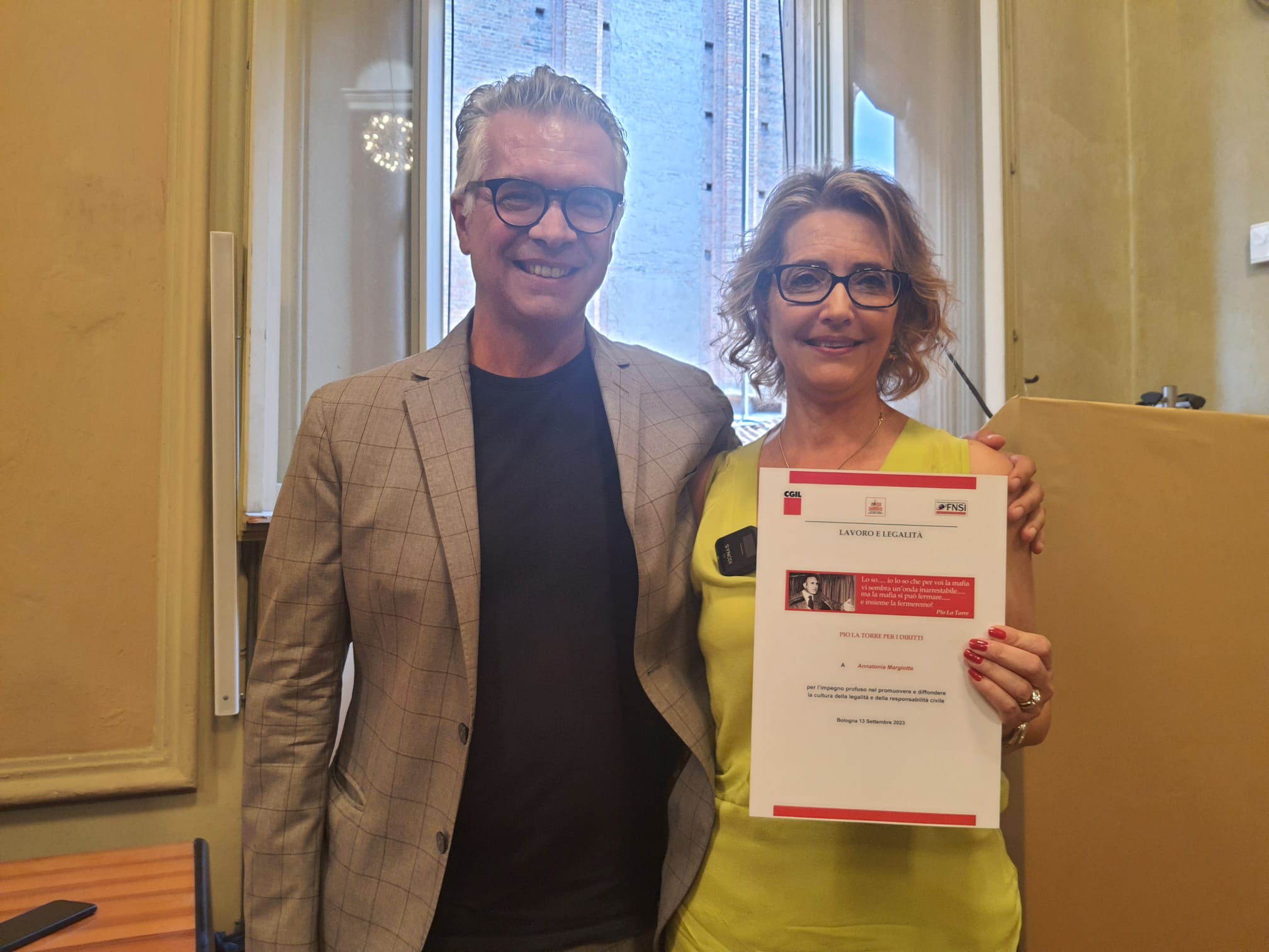 Annatonia Margiotta, funzionaria della sezione Sicurezza del Cittadino, Politiche per la Migrazioni ed Antimafia Sociale, ieri pomeriggio a Bologna nella sala delle Armi di Palazzo Malvezzi, ha ricevuto il “Riconoscimento alla memoria di Pio La Torre” per la categoria “Amministratori locali e funzionari pubblici”.