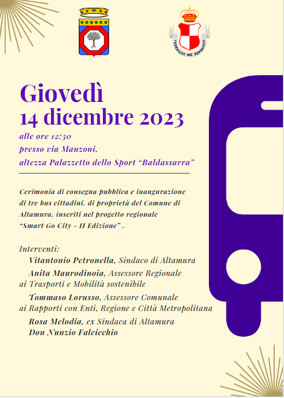 Domani, 14 dicembre, l’assessore ai Trasporti e alla Mobilità sostenibile della Regione Puglia, Anita Maurodinoia, parteciperà alla cerimonia pubblica di consegna e inaugurazione di tre bus cittadini di proprietà del Comune di Altamura, il cui acquisto è stato finanziato dal progetto regionale “Smart Go City - II Edizione” .