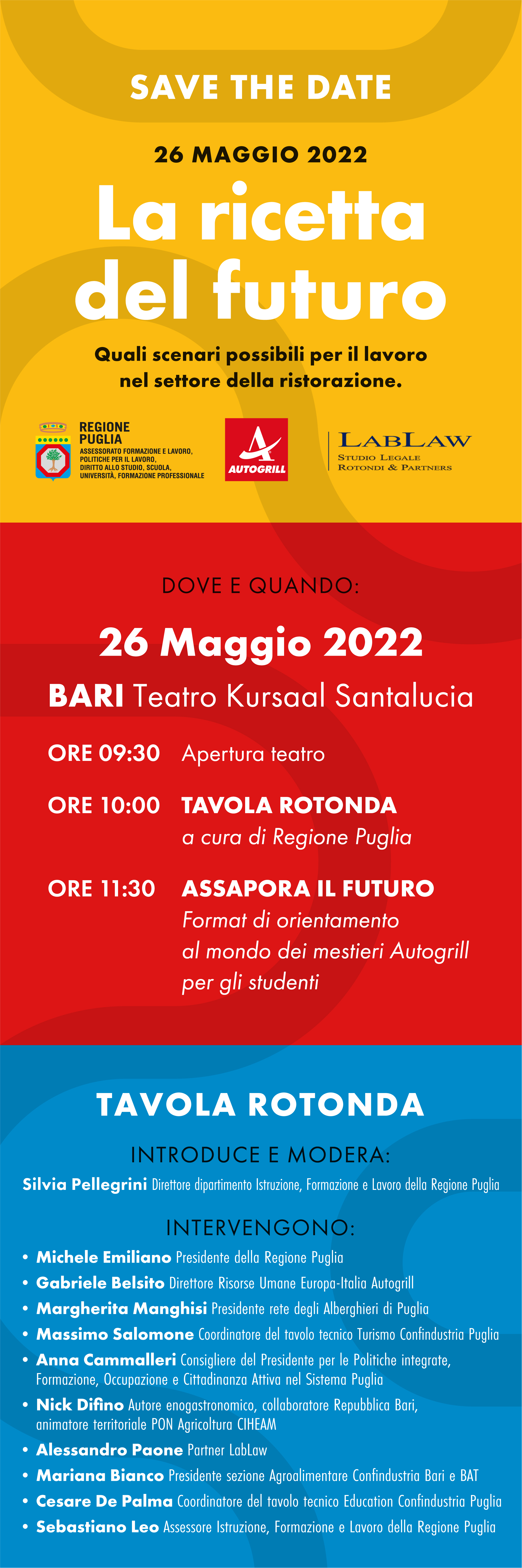 La Regione Puglia promuove l’iniziativa “La ricetta per il futuro” in collaborazione con Autogrill S.p.A, in programma giovedì 26 maggio 2022 a partire dalle 9.30 al Teatro Kursaal Santalucia di Bari, per valorizzare nuove forme di orientamento consapevole per i ragazzi e le ragazze pugliesi. L’appuntamento sarà strutturato in due momenti: la prima parte sarà dedicata alla tavola rotonda “La ricetta del futuro” in cui si avvierà una riflessione sugli sbocchi occupazionali attualmente esistenti nell’ambito della ristorazione, delle competenze richieste, della formazione on the job ma anche delle nuove frontiere dei lavori del futuro, attraverso il coinvolgimento della rete degli alberghieri della Puglia e i vari stakeholders pubblici e privati attivi strutturalmente nell'ambito dell'enogastronomia, del food e dell'agroalimentare. Nella seconda parte, invece, spazio al format a cura di Autogrill dal titolo “Assapora il futuro”, dedicato ai percorsi di orientamento e ai profili professionali richiesti.