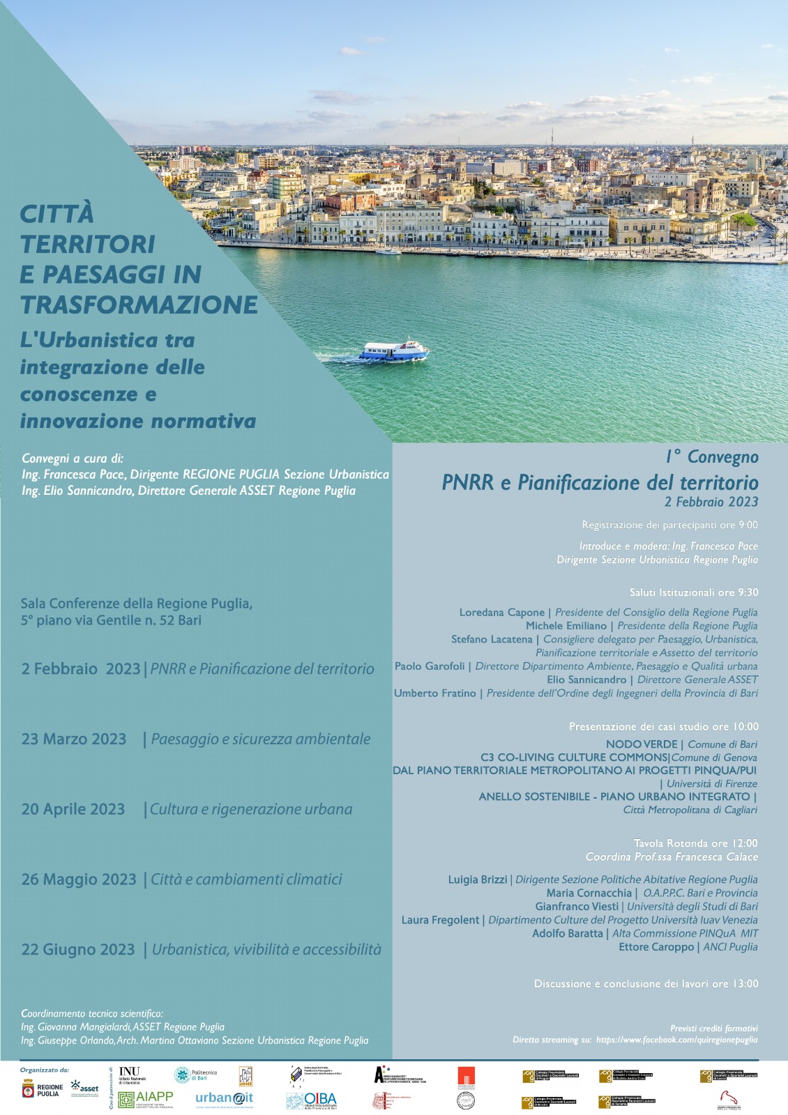 Cinque appuntamenti tematici a cadenza mensile, aperti il 2 febbraio dall’incontro “Pnrr e pianificazione del territorio”, in programma alle 9.30 nella sala conferenze della Regione (via Gentile 52, V piano). Apriranno i saluti del presidente della Regione Michele Emiliano, della presidente del Consiglio regionale Loredana Capone, del consigliere delegato all’Urbanistica Stefano Lacatena, del direttore Asset Elio Sannicandro, del direttore del dipartimento Paolo Garofoli e del presidente provinciale dell’Ordine Ingegneri Umberto Fratino. Dopo la presentazione di casi studio a Bari, Genova, Firenze e Cagliari, tavola rotonda coordinata da Francesca Calace, a cui parteciperanno Luigi Brizzi, Maria Cornacchia, Gianfranco Viesti, Laura Fregolent, Adolfo Baratta e Ettore Caroppo. Modera la dirigente della sezione Urbanistica, Francesca Pace.