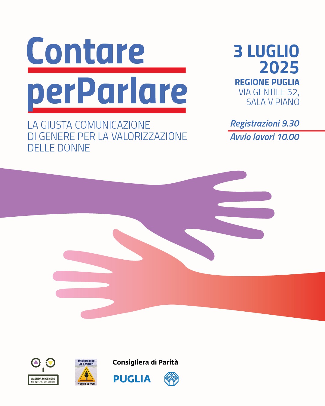 L’ufficio della Consigliera di Parità della Regione Puglia organizza l’evento formativo "Contare per Parlare - La giusta comunicazione di genere per la valorizzazione delle donne" , che si terrà giovedì 3 luglio dalle ore 9.30 nella sede della Regione Puglia di via Gentile 52 (plesso dipartimenti), sala V piano.