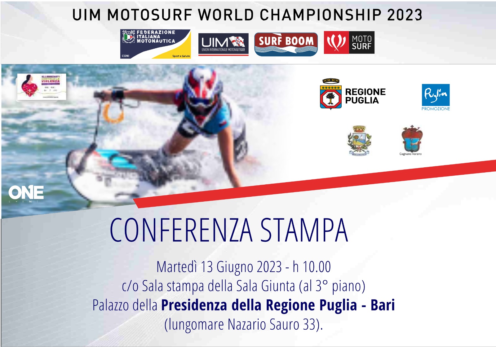 Conferenza stampa di presentazione del Motosurf World Championship 2023 martedì 13 giugno 2023 ore 10.00, Palazzo della Presidenza della Regione Puglia a Bari