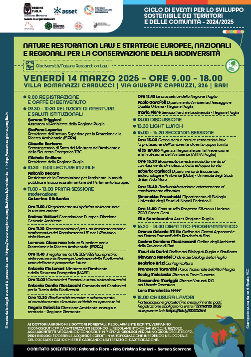 I nuovi scenari comunitari per la sostenibilità ambientale e la conservazione della biodiversità saranno scandagliati a Bari venerdì 14 marzo, dalle 9.30 alle 18.00 nella Sala conferenze di Villa Romanazzi Carducci, nell’incontro "Nature Restoration Law e strategie europea, nazionale e regionale per la conservazione della biodiversità". L'evento, organizzato dal Dipartimento Ambiente della Regione Puglia e da Asset, si inserisce nel ciclo di incontri dedicati allo "Sviluppo sostenibile dei territori e delle comunità - 2024-2025" e rientra nel quadro della Strategia Regionale di Sviluppo Sostenibile della Regione Puglia.