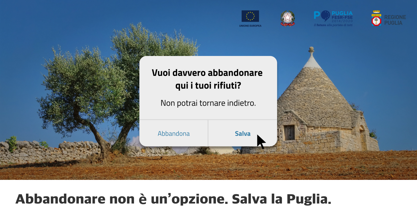 La Regione Puglia ha adottato la Strategia regionale e messo a punto la campagna di comunicazione finalizzata alla sensibilizzazione e al contrasto dell’abbandono dei rifiuti, con lo slogan “Abbandonare non è un opzione. Salva la Puglia”.