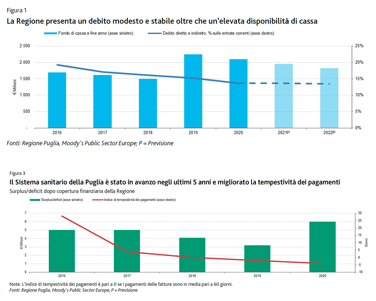 La Regione Puglia presenta un debito modesto e stabile oltre che un’elevata disponibilità di cassa. Maggiori trasferimenti correnti dal Governo hanno compensato la modesta decrescita delle entrate tributarie indotta dall’impatto del Coronavirus. Il Sistema sanitario della Puglia è stato in avanzo negli ultimi cinque anni e ha migliorato la tempestività dei pagamenti. Sono i tre giudizi attorno a cui Moody’s articola il suo giudizio positivo sulla reputazione della Regione Puglia, confermando anche per il 2021 il valore “Baa3, Stabile”, lo stesso che l’agenzia internazionale di rating attribuisce all'Italia.