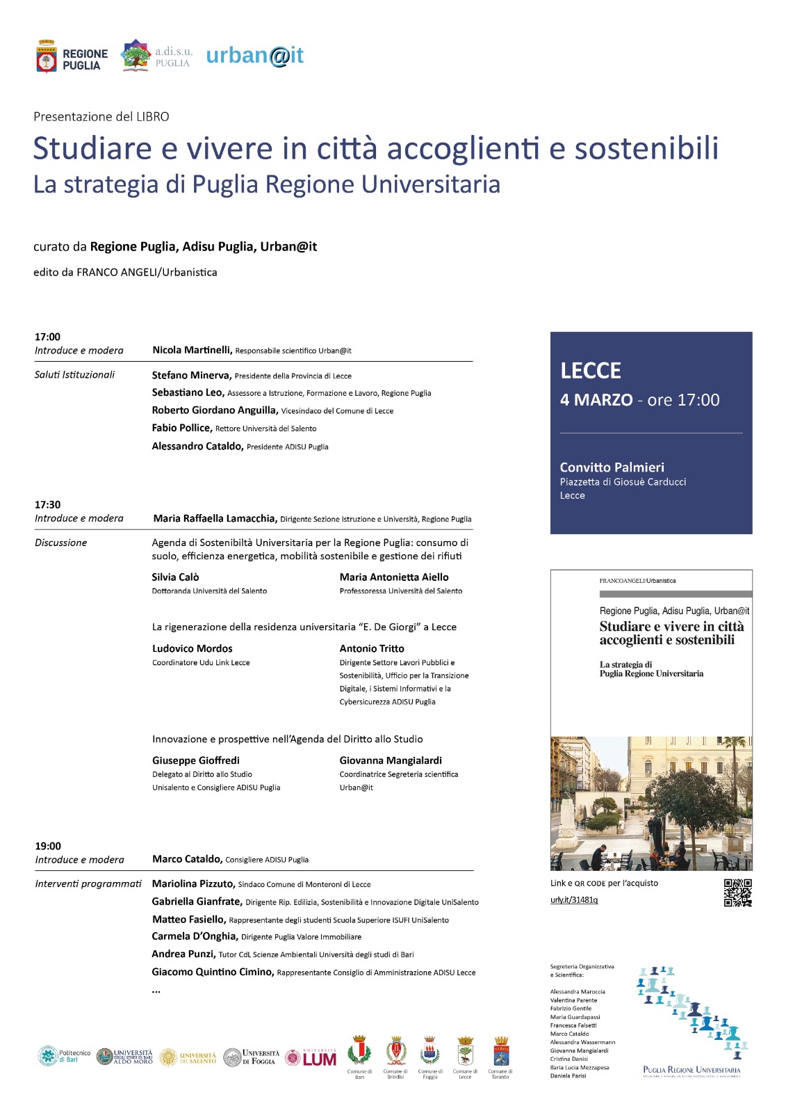 Sarà il Convitto Palmieri di Lecce ad ospitare domani 4 marzo ore 17 la terza tappa del tour di presentazione del volume “Studiare e vivere in città accoglienti e sostenibili” (Franco Angeli editore) dedicato al percorso istituzionale e di ricerca avviatosi nel febbraio 2021 dall’Assessorato regionale all’Istruzione e Università e dall'Adisu Puglia, sotto il coordinamento scientifico di Urban@it.