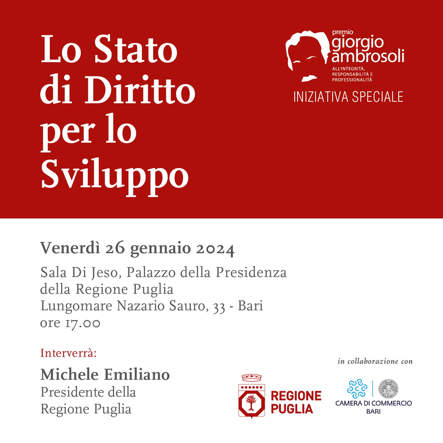 Domani, 26 gennaio, alle ore 17, nella sala Di Jeso della Presidenza della Regione Puglia (Lungomare Nazario Sauro) si terrà il seminario “Lo Stato di Diritto per lo Sviluppo”, organizzato da Regione Puglia e Premio Giorgio Ambrosoli in collaborazione con la Camera di Commercio di Bari.