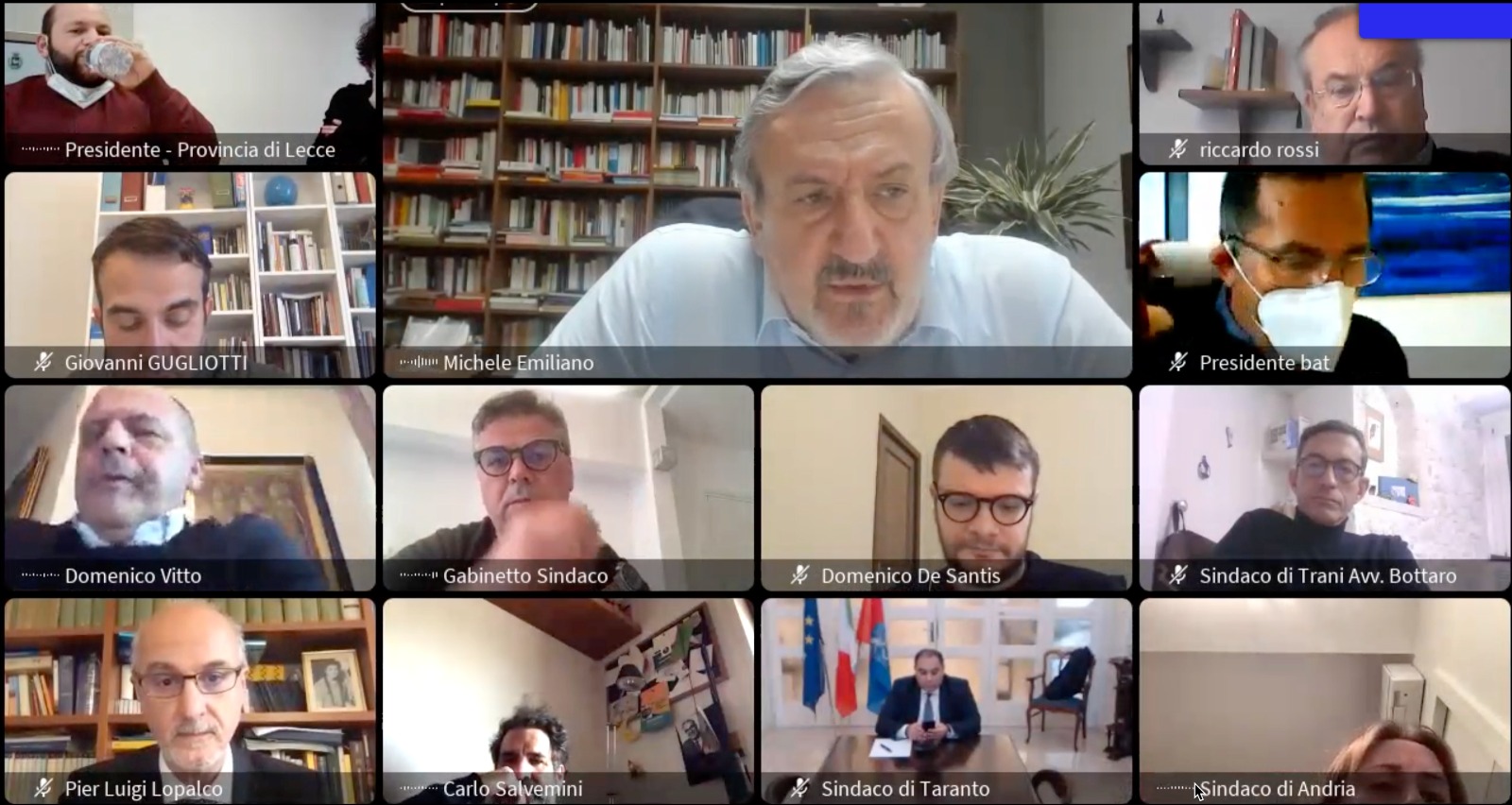 Il Presidente della Regione Puglia Michele Emiliano ha convocato per questo pomeriggio alle ore 15.00, in videoconferenza, un incontro urgente sull’emergenza Covid in Puglia con i sindaci delle città capoluogo e i presidenti di provincia prima, e successivamente i rappresentanti del partenariato socioeconomico.