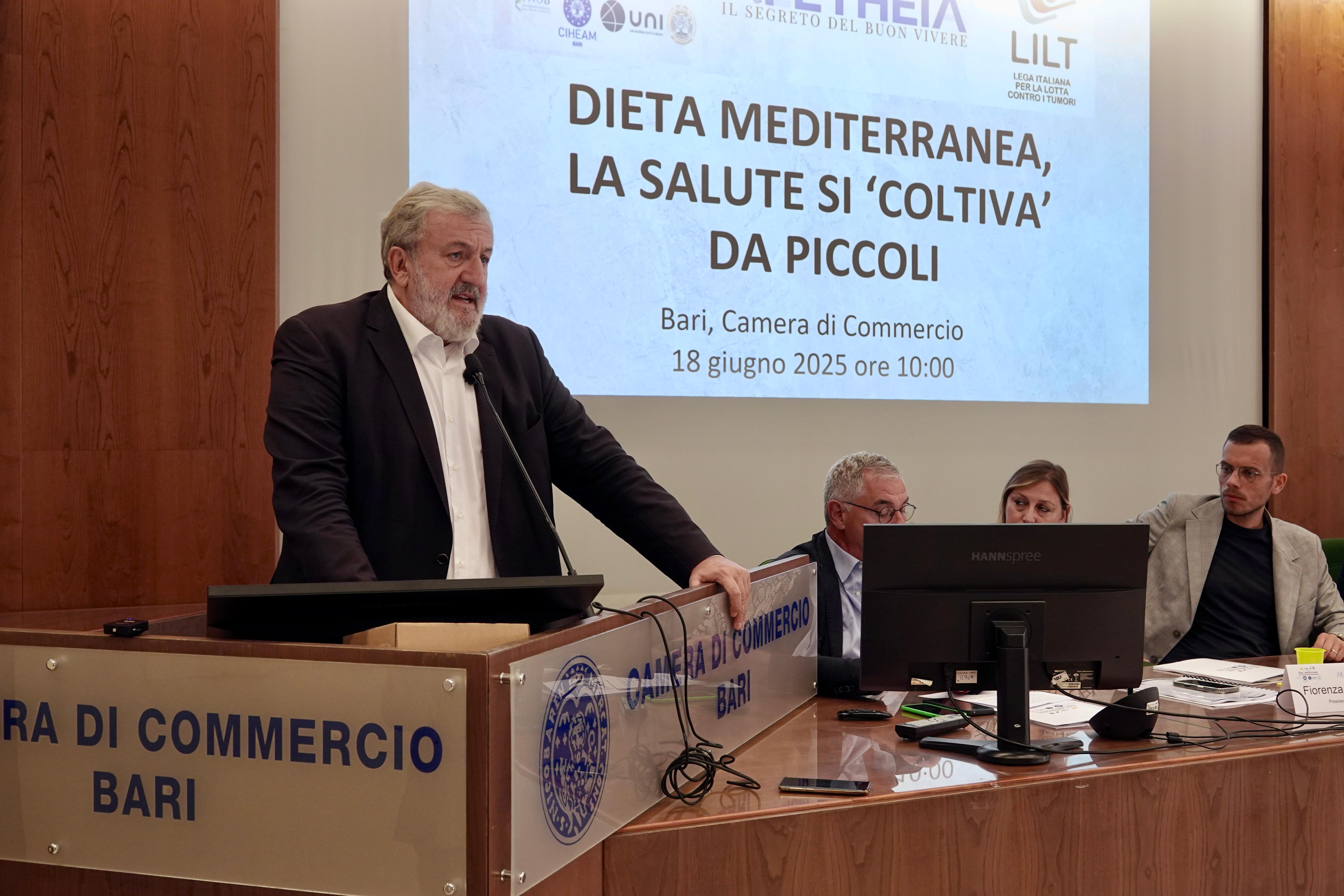 Lo ha affermato il presidente della Regione Puglia Michele Emiliano intervenendo questa mattina al convegno "Dieta Mediterranea, la salute si coltiva da piccoli", alla Camera di Commercio di Bari, organizzato da Fondazione ALETHEIA, gruppo di lavoro scientifico che studia il rapporto tra cibo e salute, LILT (Lega Italiana per la Lotta contro i tumori) e l’Osservatorio Dieta Mediterranea.
