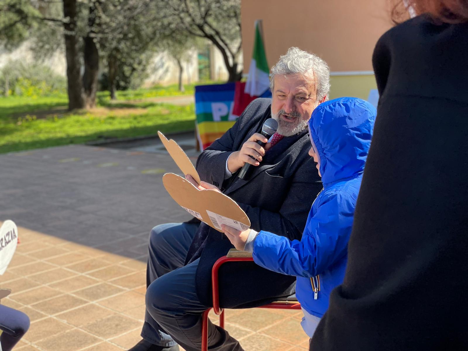 Insieme alla dirigente scolastica Serenella Teresa Varrese, il presidente Emiliano ha parlato con i bambini dei principi fondamentali della Costituzione Italiana. “La guerra però non si può spiegare neanche ai nonni, come lo sono io. - ha aggiunto Emiliano a proposito della situazione internazionale e delle ripercussioni che le notizie hanno sui bambini - È una cosa che attiene a quella parte oscura dell’umanità che però i piccoli devono imparare a riconoscere per difendersi e per superarla anche dentro se stessi”.