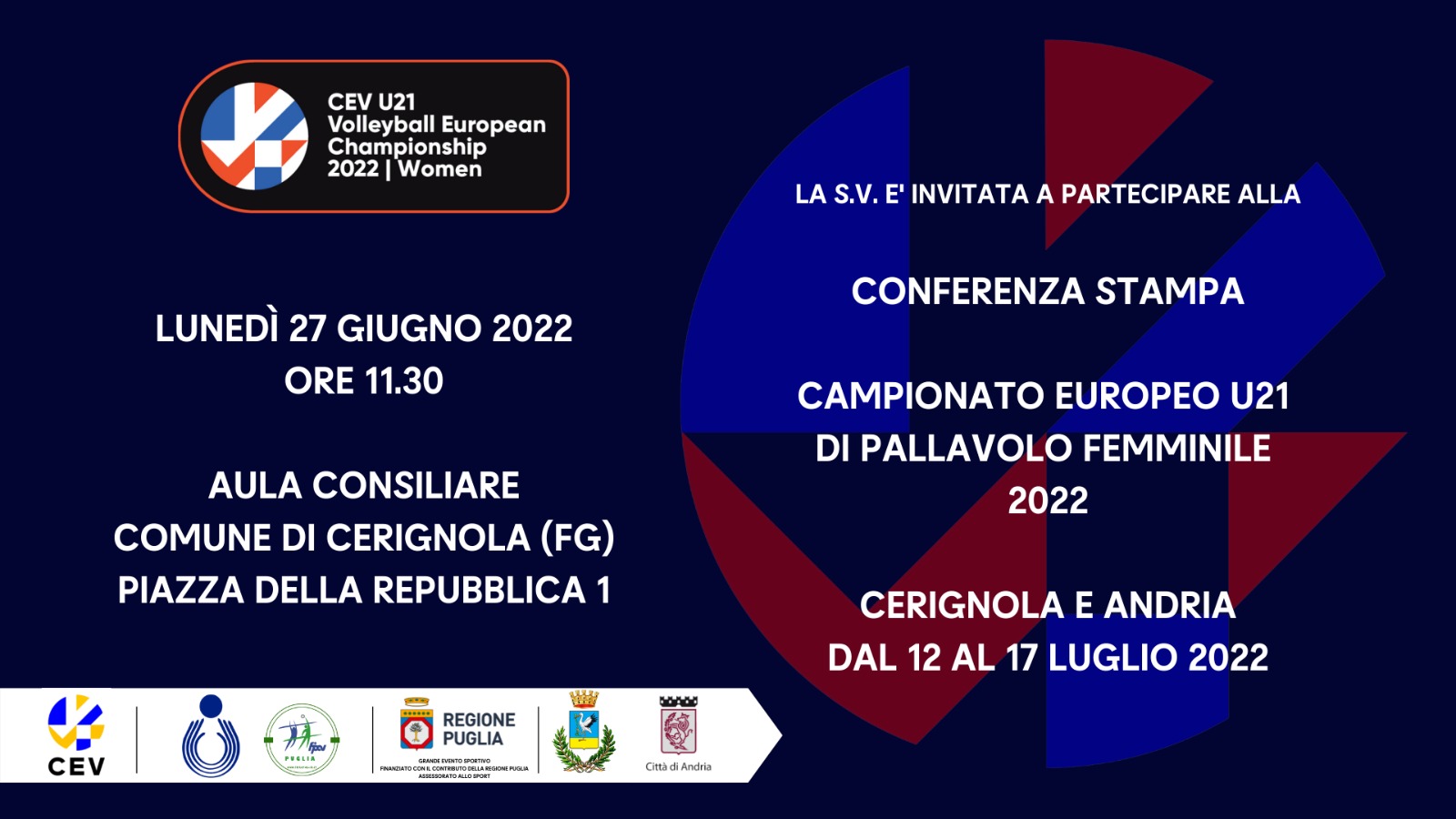 L'Europeo U21 femminile sarà presentato ufficialmente lunedì 27 giugno alle ore 11.30 presso l'Aula Consiliare del Comune di Cerignola (Piazza della Repubblica 1) in una conferenza stampa alla quale prenderanno parte il Presidente della Federazione Italiana Pallavolo Giuseppe Manfredi, Il Vice Presidente e Assessore regionale con delega allo Sport, l’Assessore Regionale all’Istruzione, Formazione e Lavoro, il Presidente del CONI Puglia Angelo Giliberto, i Sindaci dei Comuni di Cerignola Francesco Bonito e Andria Giovanna Bruno, il Presidente del CR FIPAV Puglia Paolo Indiveri.