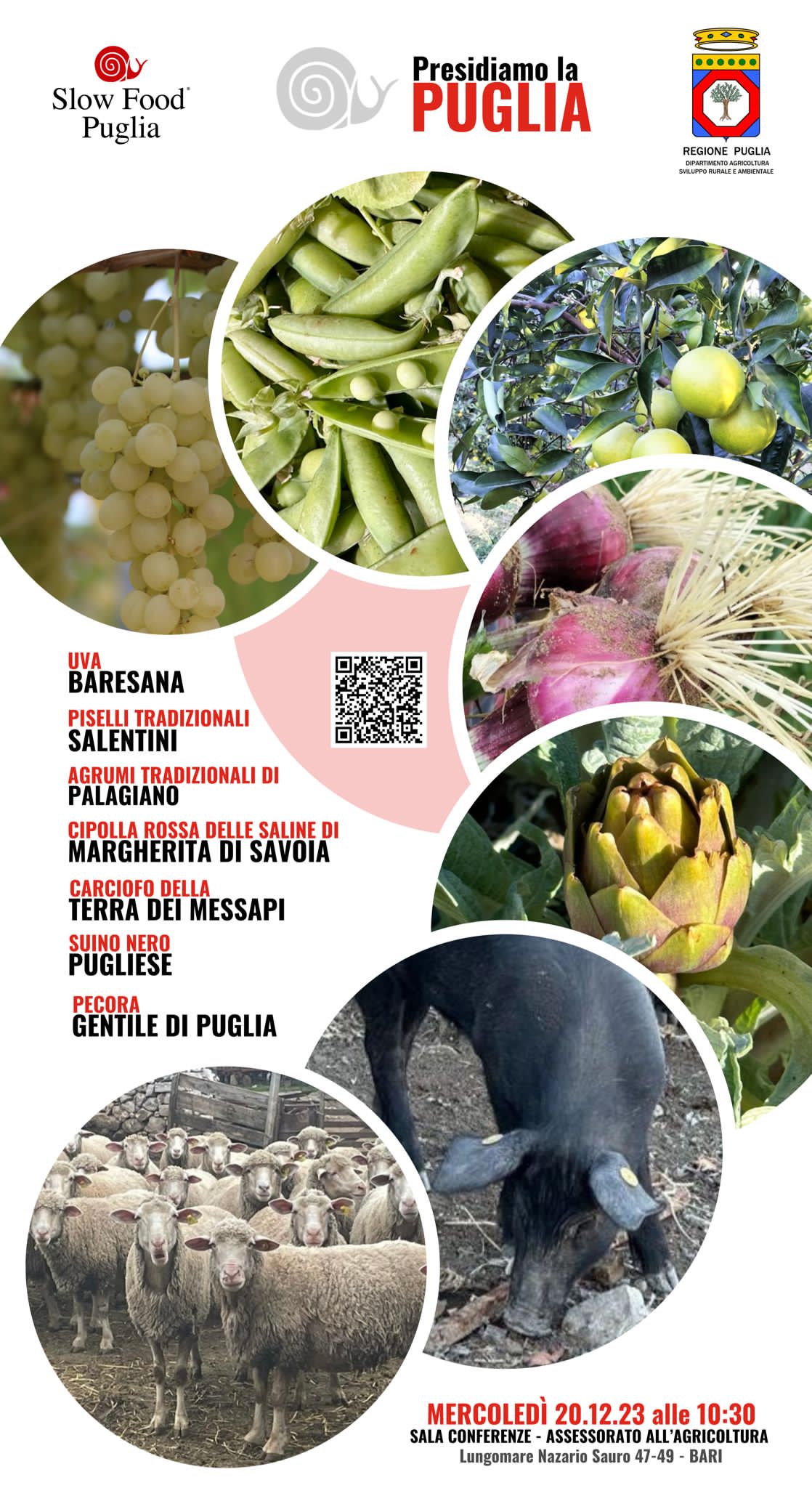 Mercoledì 20 dicembre, ore 10.30, nella sala conferenze del Dipartimento Agricoltura della Regione Puglia, lungomare N. Sauro 45-47 a Bari, saranno illustrati i risultati del secondo step del progetto “Presidiamo la Puglia” volto alla valorizzazione delle eccellenze agroalimentari regionali. Il progetto, frutto della sinergia tra Regione Puglia e Slow Food Puglia, ha portato all’istituzione di sette nuovi presìdi che vanno ad aggiungersi ai cinque presentati esattamente un anno fa a conclusione del primo step dello stesso progetto. Alla conferenza stampa prenderanno parte l’assessore alle Politiche Agricole della Regione Puglia, Donato Pentassuglia, il presidente di Slow Food Puglia, Marcello Longo, i referenti dei presìdi e i produttori locali.