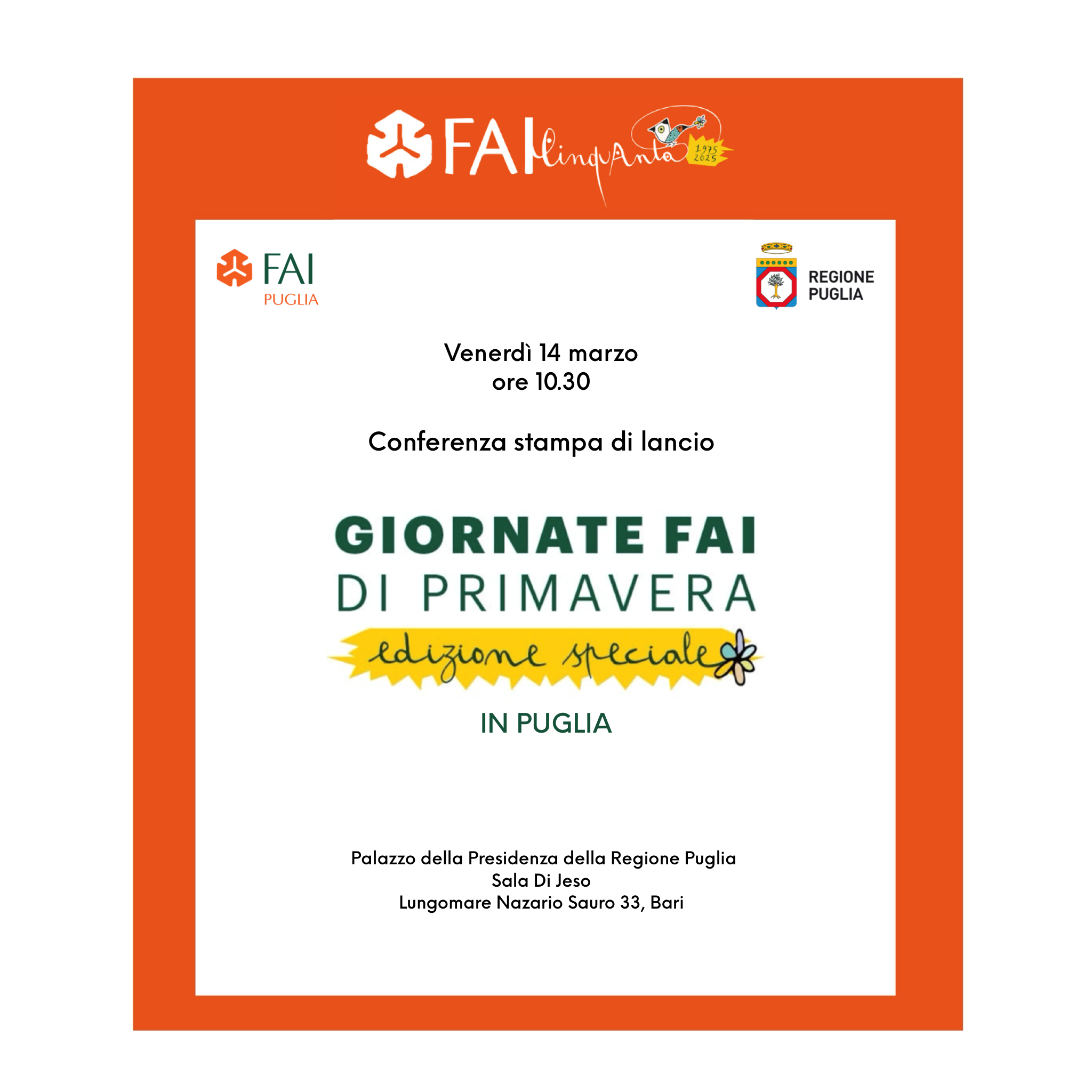 Venerdì 14 marzo, alle ore 10.30, nella Sala Di Jeso del Palazzo di Presidenza della Regione Puglia (Lungomare Nazario Sauro n. 33 – Bari), si terrà la conferenza stampa di presentazione della 33ª edizione delle Giornate FAI di Primavera, in programma sabato 22 e domenica 23 marzo 2025 in 400 città italiane, di cui 51 pugliesi.