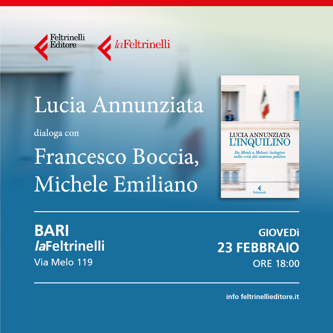 Giovedì 23 febbraio, alle ore 18.00, nella libreria Feltrinelli, via Melo 119, a Bari, il presidente Michele Emiliano e il sen. Francesco Boccia dialogheranno con la giornalista Lucia Annunziata sul suo ultimo libro “L’inquilino. Da Monti a Meloni: indagine sulla crisi del sistema politico” (Feltrinelli Editore).