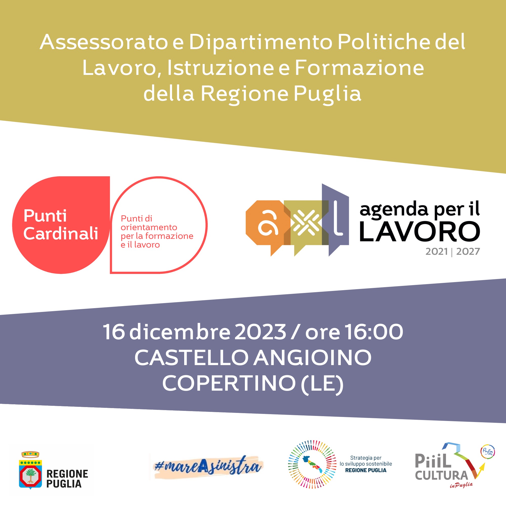 Il 16 dicembre, a partire dalle ore 16, nel Castello Angioino di Copertino l’assessore regionale al Diritto allo Studio Sebastiano Leo dialogherà con tutte le amministrazioni comunali della Regione Puglia, gli operatori dei settori della formazione e del lavoro, le associazioni di categoria, gli ITS, le organizzazioni sindacali e datoriali, sulle prospettive future del mondo del lavoro e della formazione a partire dall’orientamento. Modera il dibattito la giornalista Fabiana Pacella.