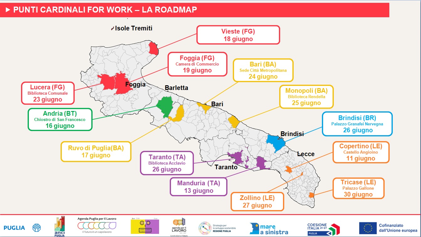 Prenderà avvio domani, nella cornice del Castello Angioino di Copertino, il percorso territoriale di presentazione del nuovo Avviso “Punti Cardinali for work. Punti di orientamento per la formazione e il lavoro”. Nell’occasione, l’assessore regionale all’Istruzione, Formazione e Lavoro Sebastiano Leo condividerà con tutte le amministrazioni comunali e provinciali della Puglia, gli operatori dei settori della formazione e del lavoro, le associazioni di categoria, gli ITS, le Università, le organizzazioni sindacali e datoriali, i contenuti del nuovo bando e il relativo tour di presentazione. Tredici le tappe in programma che attraverseranno tutto il territorio regionale, da Foggia a Tricase fino alla fine di giugno.