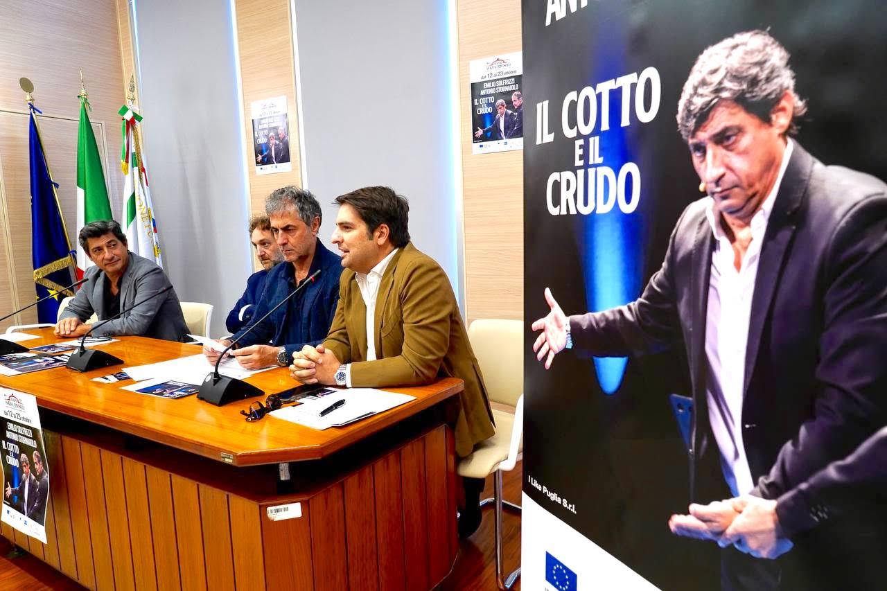Presentato questa mattina nel palazzo della Regione Puglia il felice connubio tra teatro e promozione turistico-culturale messo in campo dall’Assessorato regionale al Turismo, Pugliapromozione, Teatro Pubblico Pugliese e gli attori Emilio Solfrizzi e Antonio Stornaiolo con la collaborazione del teatro romano Ambra Jovinelli, che aprirà la sua stagione con lo spettacolo tutto pugliese “Il cotto e il crudo” di Solfrizzi e Stornaiolo, brandizzato #WeAreInPuglia.