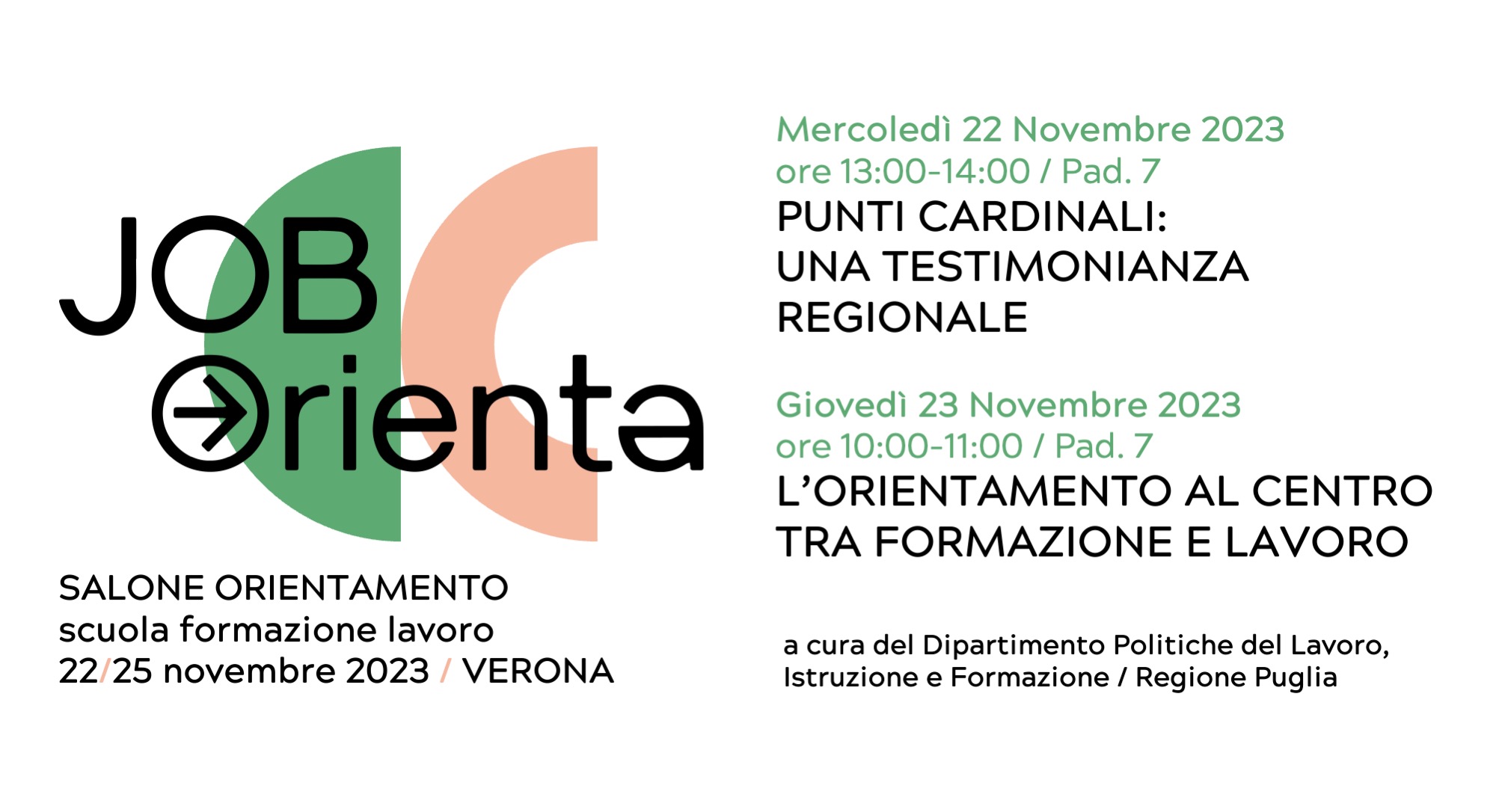 La Regione Puglia partecipa alla 32^ edizione di Job&Orienta, il più importante Salone nazionale dedicato a Orientamento, Scuola, Formazione e Lavoro, in programma dal 22 al 25 novembre a Verona.