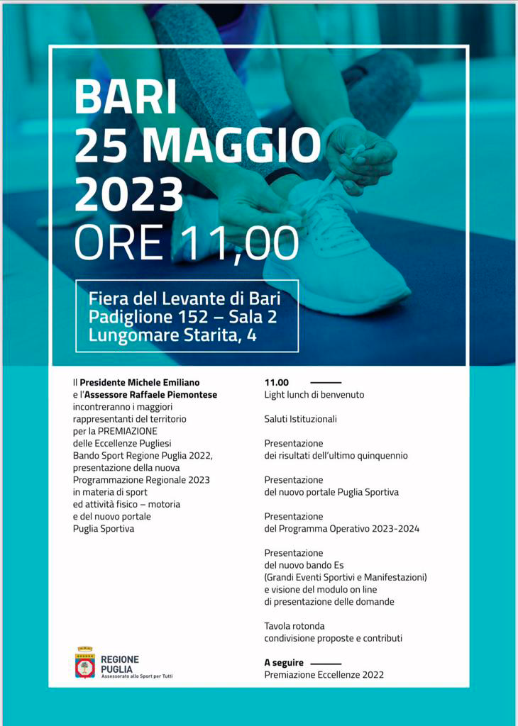 Nel corso della mattinata, si svolgerà un confronto con le realtà istituzionali e associative sulla nuova programmazione regionale 2023 in materia di sport e attività fisico-motoria, sarà illustrato il nuovo bando per Grandi Eventi Sportivi e Manifestazioni e presentato il nuovo portale web dedicato alle politiche sportive della Regione Puglia.