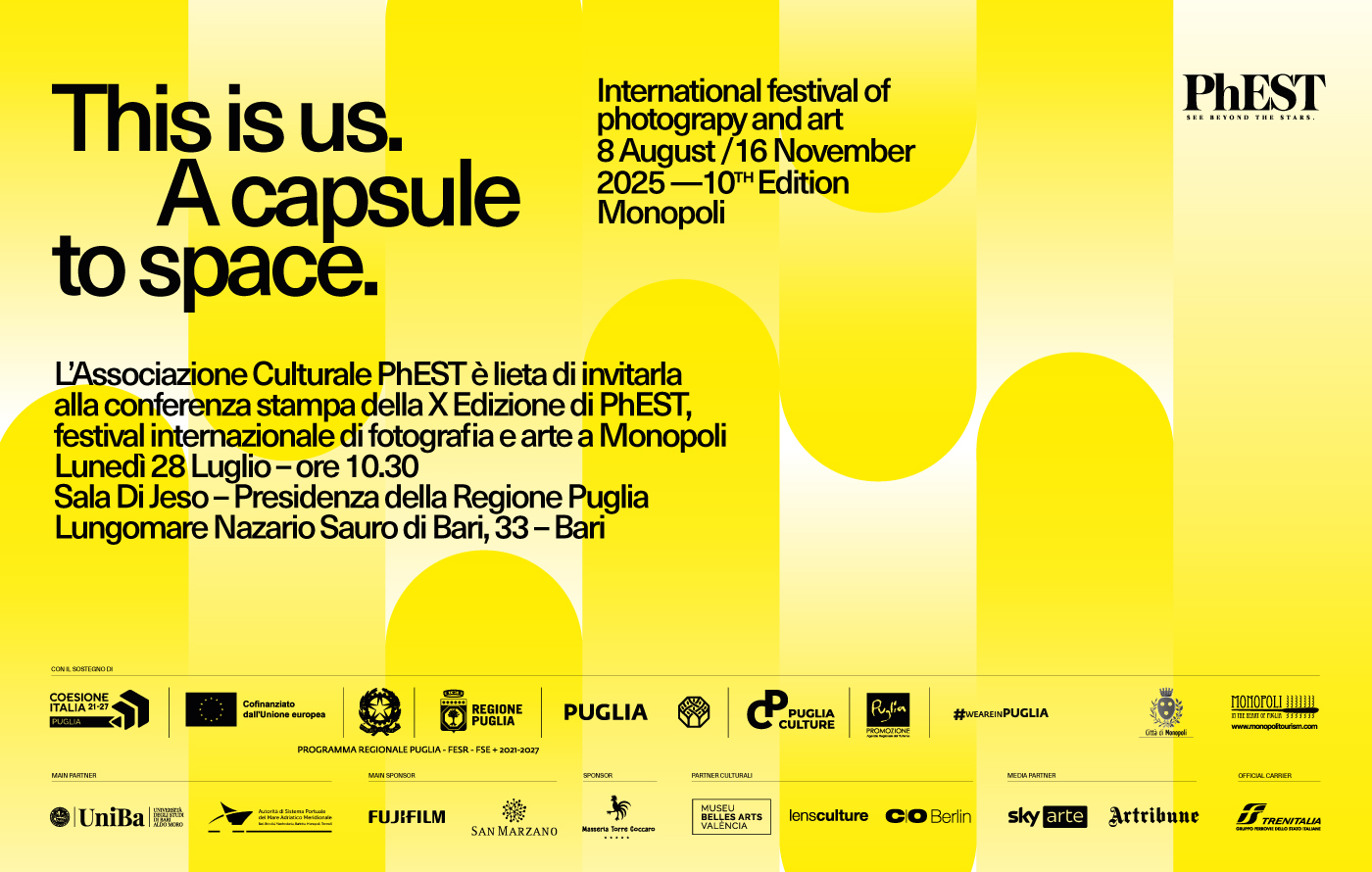 Un’edizione espansa nel tempo e nello spazio, che guarda al futuro ma affonda le radici in dieci anni di visioni, relazioni e trasformazioni. Per celebrare i suoi dieci anni, PhEST ospiterà anche la serie completa delle residenze artistiche realizzate nei suoi primi 10 anni, e un totale di oltre 30 mostre e installazioni di artisti internazionali che hanno accolto la sfida e l’invito a partecipare, molti dei quali saranno anche presenti a Monopoli nelle giornate inaugurali e durante gli oltre tre mesi e mezzo di apertura da agosto a novembre.