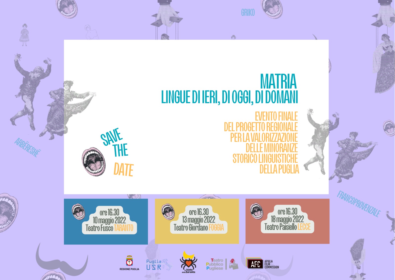 Tre eventi nei teatri con Apulia Film Commission, Teatro Pubblico Pugliese, Notte della Taranta e Ufficio scolastico regionale. Sarà il Teatro Fusco di Taranto ad ospitare martedì 10 maggio alle ore 16.30 il primo evento del tour conclusivo del progetto regionale “Matria. Le lingue di ieri, di oggi e di domani”, finalizzato a promuovere e tutelare il patrimonio linguistico storico delle minoranze francoprovenzale, arbëreshë e grika, presenti in Puglia. Studenti musicisti, danzatori, cantanti e rappresentanti istituzionali dei territori di tradizione linguistica minoritaria per celebrare insieme i valori della diversità, del multiculturalismo, del dialogo, per ricordare una storia che va avanti da secoli di cui la Puglia è portatrice nel segno della tutela del pluralismo linguistico.