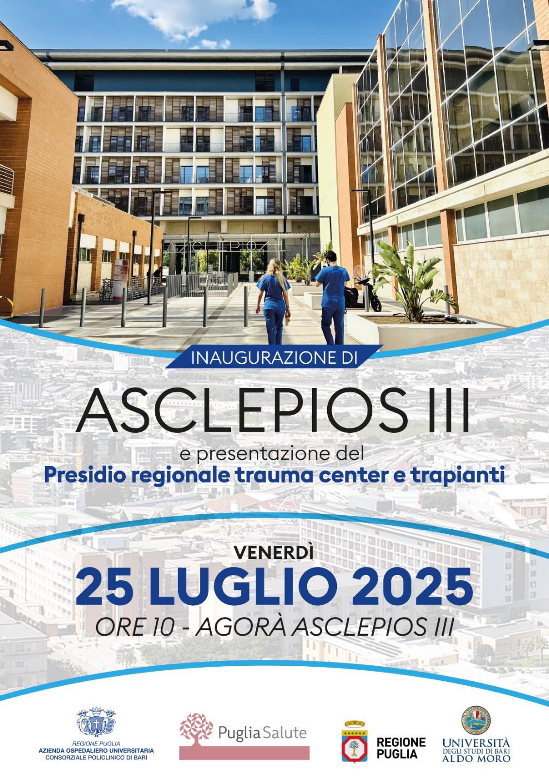 Venerdì 25 luglio, dalle ore 10.00, presso l'agorà del padiglione Asclepios III del Policlinico di Bari (p.zza G.Cesare), si terrà l’inaugurazione ufficiale del padiglione Asclepios III e la presentazione del Presidio regionale trauma center e trapianti.