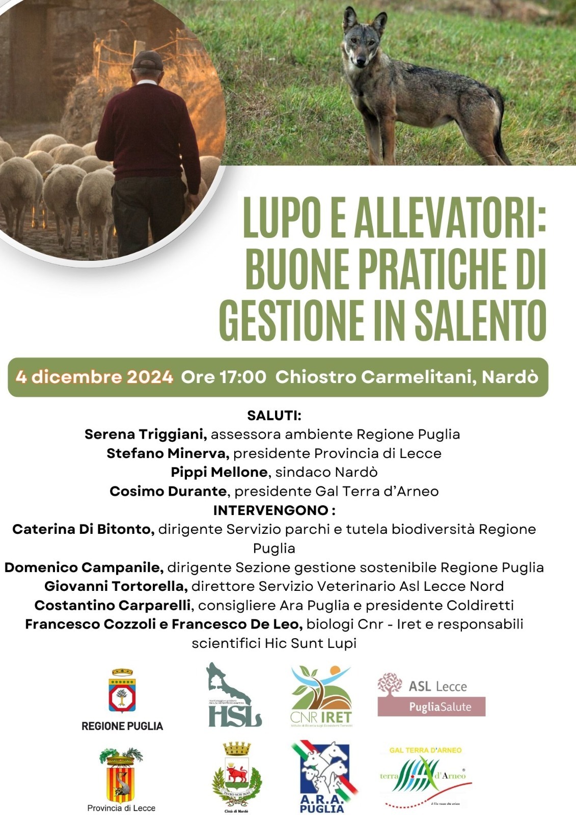 Il ritorno del lupo sul territorio è un tema che abbraccia una molteplicità di attori in campo e una complessità di dinamiche che vanno analizzate tutte, una per una, ognuna con le proprie peculiarità e sensibilità. Per gli allevatori salentini il ritorno del lupo è un fenomeno inedito e molte aziende sono comprensibilmente impreparate ad affrontarlo. Per questo è stato pensato un evento per iniziare a fare informazione sulle buone pratiche di gestione e prevenzione e sui bandi a disposizione per le aziende che Regione Puglia mette in campo per sostenere le misure di protezione del bestiame. Questi e molti altri temi saranno affrontati nel corso dell’incontro.