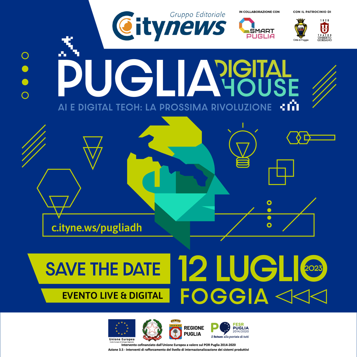 Si terrà domani 12 luglio, a partire dalle ore 9 (ingresso libero, previa registrazione) presso la Sala Fedora del Teatro Giordano di Foggia l’evento “Puglia Digital House”, organizzato da Citynews, azienda leader in Italia nell’informazione digitale (editrice di 53 quotidiani metropolitani online, della testata nazionale Today, del canale internazionale EuropaToday e delle testate verticali CiboToday e AgrifoodToday) in collaborazione con la Regione Puglia.