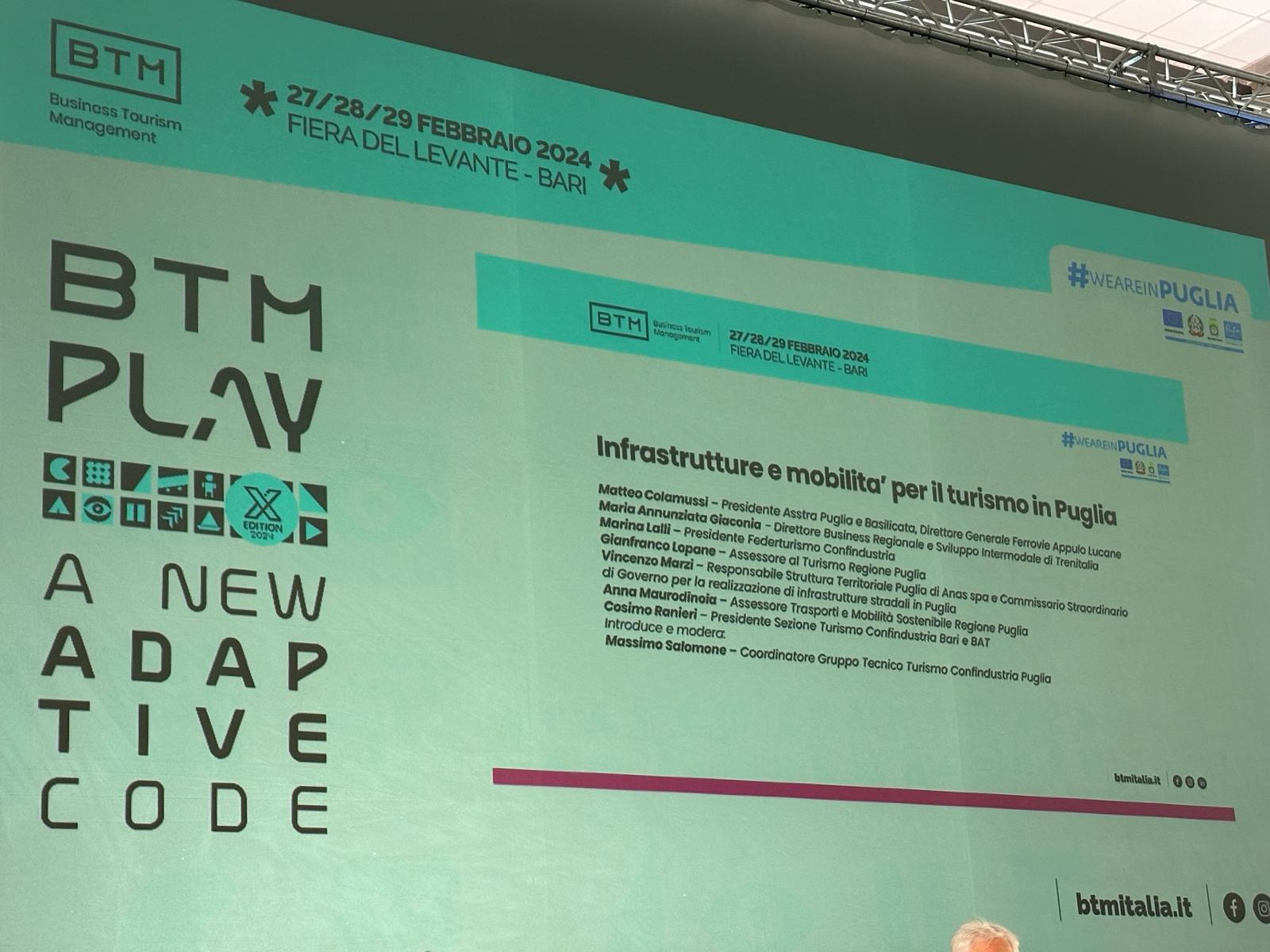 In occasione della BTM 2024, in corso alla Fiera del Levante di Bari, ieri l’assessore al Turismo Gianfranco Lopane e l’assessore ai Trasporti e alla Mobilità sostenibile Anita Maurodinoia hanno partecipato al panel “Infrastrutture e mobilità per il turismo”, moderato da Massimo Salomone, coordinatore del gruppo tecnico Turismo di Confindustria Puglia. Hanno partecipato Matteo Colamussi, presidente Asstra Puglia e Basilicata e direttore generale Ferrovie Appulo Lucane, Maria Annunziata Giaconia, direttore di Business Regionale e Sviluppo Intermodale di Trenitalia, Vincenzo Marzi, responsabile Struttura Territoriale Puglia di Anas spa e commissario straordinario di Governo per la realizzazione di infrastrutture stradali in Puglia, Marina Lalli, presidente Federturismo Confindustria, e Cosimo Ranieri, presidente Sezione Turismo Confindustria Bari e BAT.