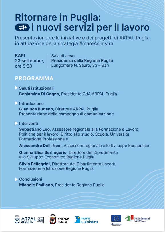 Riportare in Puglia chi è emigrato per motivi di lavoro, offrendo opportunità di rientro e di benessere, associando lavoro e contrasto allo spopolamento dei nostri territori. Questo l’obiettivo della strategia #mareAsinistra della Regione Puglia, nella quale l’Agenzia regionale per le politiche attive del lavoro svolge un ruolo fondamentale nella ricerca di talenti ad elevata specializzazione da inserire nel sistema produttivo regionale.