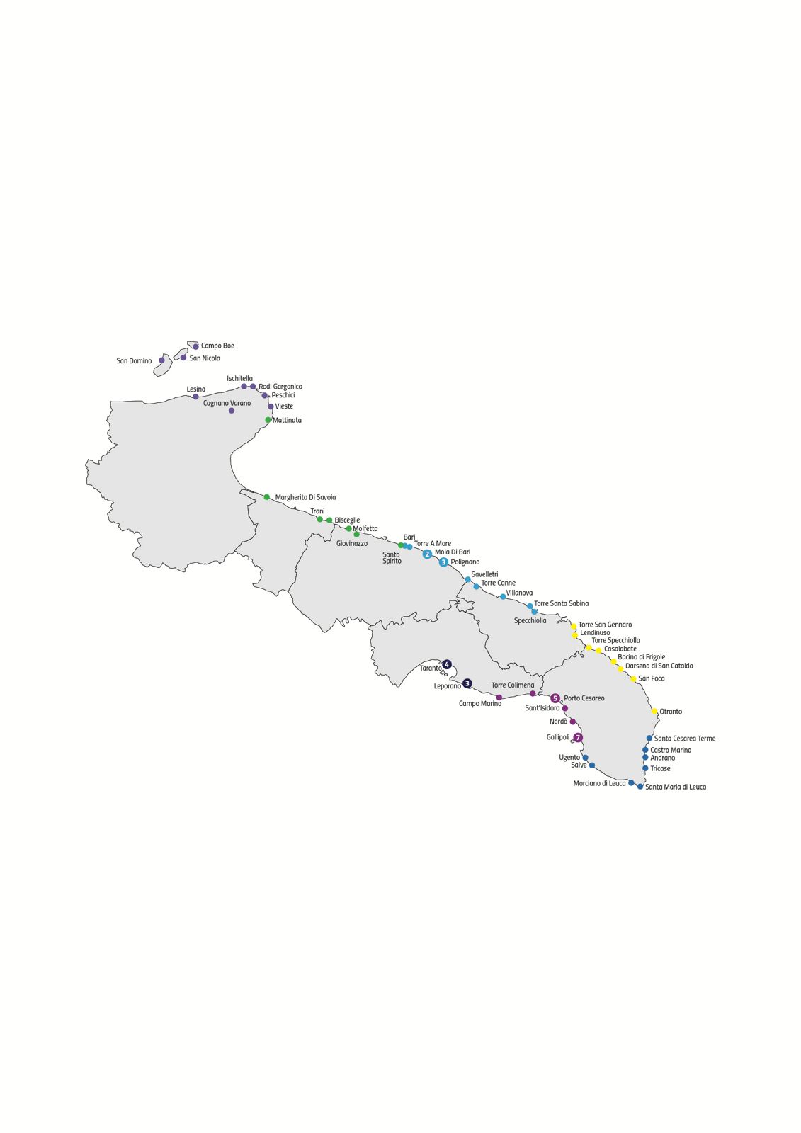 Dal documento emerge che nel territorio pugliese si contano 73 porti, di cui 67 di interesse regionale, che costituiscono il Sistema dei Porti della Regione Puglia, più altri 6 di rilevanza internazionale e nazionale.