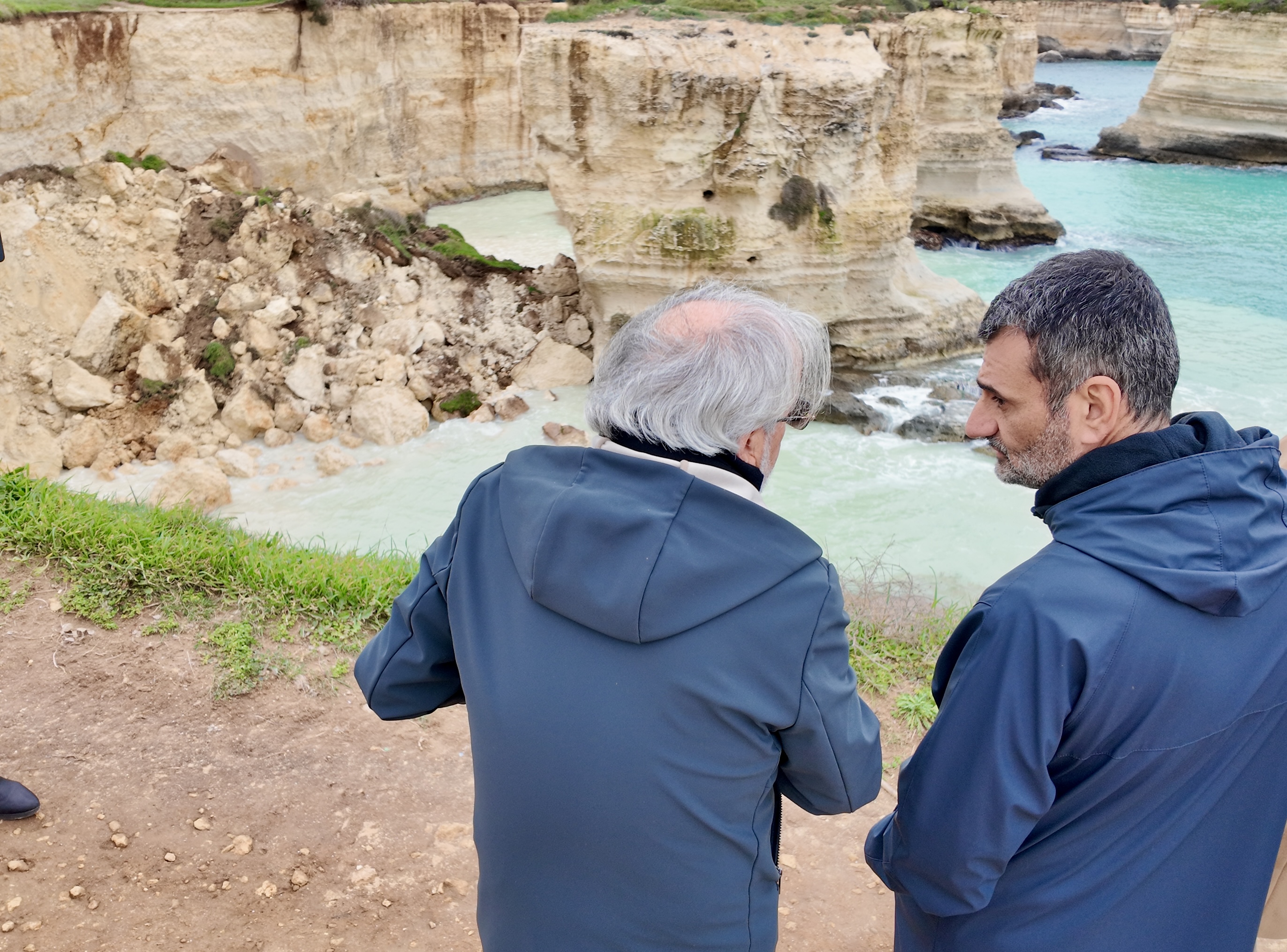Questa mattina il presidente della Regione Puglia Antonio Decaro si è recato, insieme al sindaco Maurizio Cisternino, a Torre Sant’Andrea e a Torre dell’Orso, sul litorale di Melendugno, per un sopralluogo utile a verificare le condizioni della costa dopo il crollo avvenuto ieri.