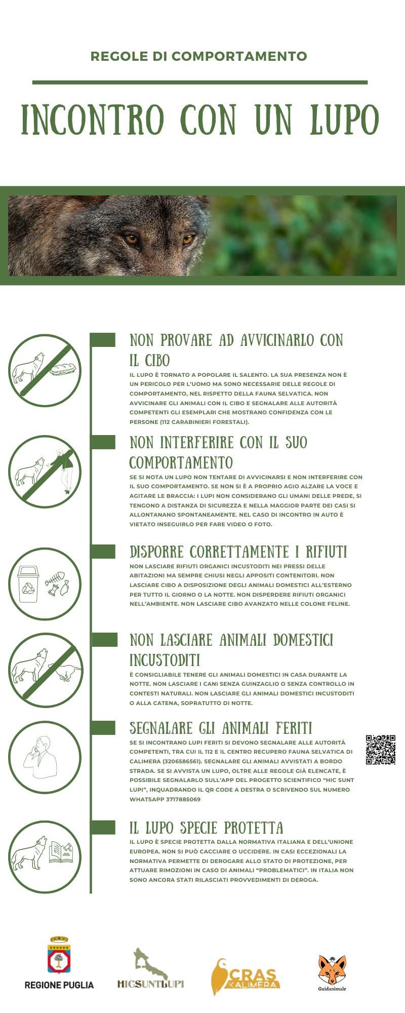 Un accordo di collaborazione con l’Ordine dei veterinari della provincia di Lecce. È un’altra delle iniziative del progetto Hic Sunt Lupi, che si occupa di studio e monitoraggio del lupo nel territorio salentino, in collaborazione tra Assessorato all’Ambiente della Regione Puglia, Cnr - Iret e Università di Roma La Sapienza. In poco tempo ogni studio veterinario della provincia sarà fornito del decalogo “Incontro con un lupo. Regole di comportamento”, un vademecum che contiene raccomandazioni utili per gestire il ritorno di questo predatore sul territorio, con piccoli accorgimenti da parte di tutti. Tra le varie raccomandazioni contenute nel decalogo, si ricorda soprattutto la corretta gestione dei rifiuti organici, grandi attrattori per il lupo, e la corretta gestione del proprio animale domestico, che deve essere ricoverato in casa di notte (o in un posto sicuro) e non lasciato incustodito di vagare sul territorio di giorno, in violazione della normativa vigente.