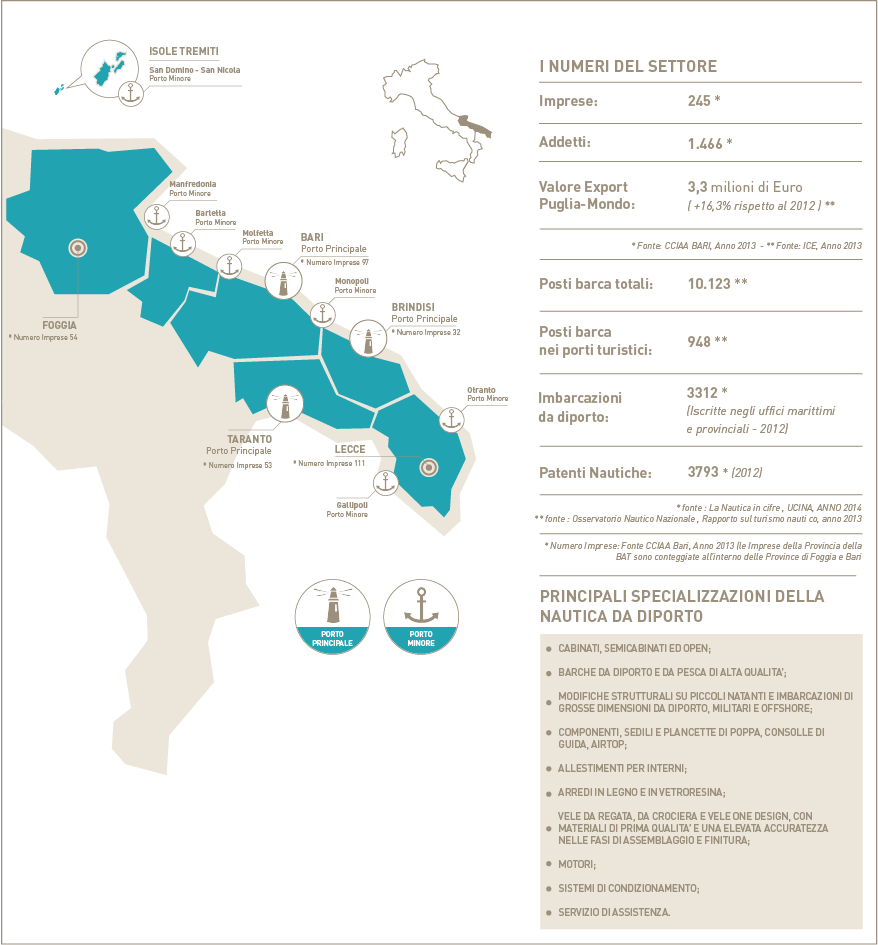 La Puglia è caratterizzata da una posizione geografica strategica, ponte tra Oriente e Occidente e porta dei Balcani, e da una costa che si snoda per ben 865 km, dotata di 3 porti principali (Bari, Brindisi e Taranto) e 6 minori. Queste caratteristiche, unite alla bellezza del mare, al clima mite tutto l’anno, ad una fitta presenza di porti, marine, darsene e approdi, ad un tessuto industriale moderno e dinamico, hanno fatto della Puglia il territorio ideale per lo sviluppo della nautica da diporto.