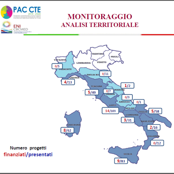 È online la Relazione sintetica sullo stato di partecipazione dell’Italia al 1° bando per Progetti Standard del Programma ENI CBC MED 2014-2020. Il documento è stato elaborato nell’ambito delle attività di analisi dei dati e monitoraggio finanziate dal Programma Complementare di Azione e Coesione sulla Governance nazionale dei programmi dell’obiettivo Cooperazione Territoriale 2014-2020 (PAC-CTE), a supporto del Comitato Nazionale del Programma di Vicinato.