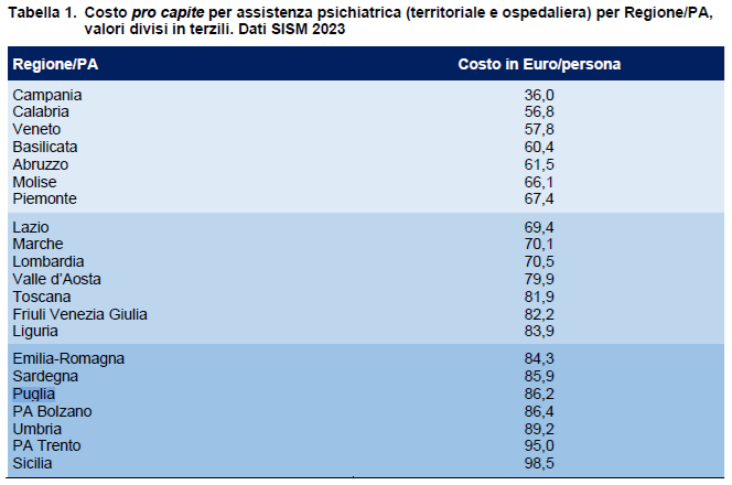 Dall’indagine emerge che in Italia il costo pro capite per l’assistenza psichiatrica territoriale e ospedaliera, calcolato dividendo il costo complessivo dell’assistenza psichiatrica per la popolazione adulta residente al 31 dicembre dell’anno precedente, è pari a 71,9 euro a persona nel 2023, con una riduzione del 2,6% rispetto al 2015. A livello regionale, nel 2023, l’indicatore varia da un valore minimo di 36,0 euro della Campania ad un massimo di 98,5 euro della Sicilia.
