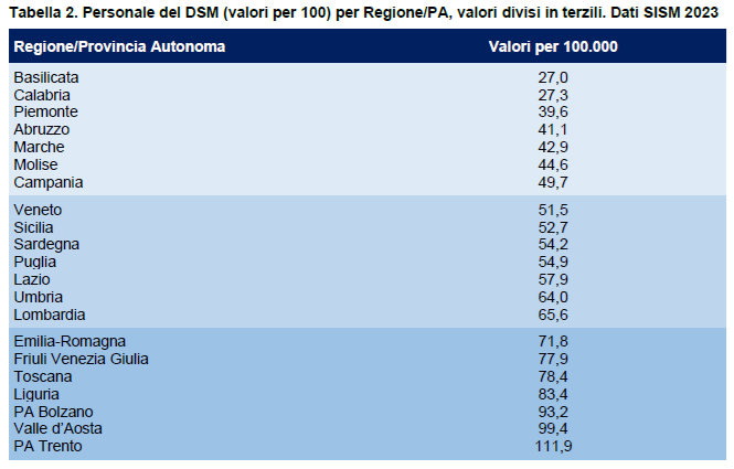 I dati mostrano che il valore nazionale del personale del Dipartimento di Salute Mentale (DSM), definito come il rapporto tra il personale attribuito ai servizi di salute mentale e il numero di abitanti residenti di età ≥ 18 anni per 100.000, varia da 58,3 per 100.000 nell’anno 2015 a 58,2 per 100.000 nel 2023. Nel 2023, la dotazione di personale delle strutture psichiatriche in Italia varia da un minimo di 27,0 per 100.000 osservato per la Basilicata a un massimo di 111,9 per la PA di Trento.
