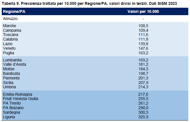 Per quanto riguarda la prevalenza trattata, ovvero il tasso del numero totale di pazienti entrati in contatto con i servizi psichiatrici almeno una volta nel corso dell’anno per 10.000 abitanti residenti di età ≥ 18 anni, si osserva che il valore nazionale varia da 159,4 per 10.000 nel 2015 a 169,5 nel 2023, in aumento del 6% rispetto al 2015. Nel 2023, tra le regioni il tasso di soggetti trattati presso i DSM varia tra un valore minimo di 108,5 delle Marche a un valore massimo di 325,9 della Liguria.