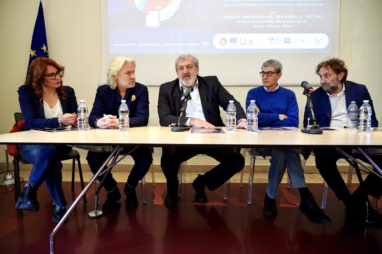 “Anche quest’anno il Medimex è un viaggio dalla Puglia al mondo e dal mondo alla Puglia. Con gli headliner proponiamo un percorso musicale che parte da due gruppi fondamentali degli anni 80, Echo & the Bunnymen e The Cult, e arriva sino ai The Murder Capital, considerati dalla critica tra i più promettenti gruppi della nuova scena post-punk, passando da idoli indiscussi degli anni 90 e 2000 come Tom Morello e Skunk Anansie e Diodato, che oltre ad essere un brillante rappresentante della scena musicale pugliese e anche un po' padrone di casa nella sua Taranto – il commento di Cesare Veronico, coordinatore artistico Medimex – Ma come sempre il programma dei concerti, che quest’anno ritorna al format con tre serate, è solo un parte di questo viaggio. Quest’anno spaziamo tra tutti i generi musicali con appuntamenti dedicati al Jazz, alla musica d’autore, al pop e alla black music e proponiamo due mostre imperdibili dedicate a Lou Reed, che ci ha lasciati da dieci anni, e agli appassionati di Rock. E ancora viaggiamo attraverso i temi e gli aspetti più importanti del music business internazionale con un ricco segmento di attività professionali e riproponiamo le scuole di musica, uno dei capisaldi del Medimex. Insomma il programma è vasto e come sempre mette Taranto e la Puglia al centro della musica mondiale. Buon viaggio”.“Ribadiamo oggi un connubio inestricabile tra Taranto e il Medimex. Riteniamo che questa manifestazione sia un tributo a Taranto e a tutto il suo valore, umano e culturale che, attraverso questa manifestazione, viene comunicato al resto della regione e del mondo. - ha detto il presidente della Regione Puglia, Michele Emiliano - La conferenza stampa di oggi si svolge in un luogo magico che ha appena recuperato, grazie ai carabinieri del Nucleo artistico, opere importantissime e per la cui operazione c’è stata la soddisfazione del Ministro della Cultura. Taranto rimane la principale battaglia della Regione Puglia sotto ogni aspetto. La rinascita di questa città è evidente a tutti, è evidente dal clima che si respira in città, dall’attività e dal numero grandissimo di persone che si attivano anche dal basso. E per questo porto anche il mio saluto al fenomeno del concerto del Primo Maggio uno dei concerti dal punto di vista del metodo più innovativi al mondo. E voglio ringraziare Cesare Veronico e Puglia Promozione i protagonisti, insieme all’Amministrazione Comunale e al Sindaco, di questa rinascita culturale della città sulla quale continueremo a investire. Questo sempre che il Governo della Repubblica ci dia la possibilità di far crescere la Puglia. In questo momento abbiamo un blocco dell’FSC che ci mette in forte difficoltà perché i Fondi europei non possono più essere utilizzati per le attività culturali. Per questo ci auguriamo che al più presto, come hanno chiesto le altre Regioni italiane con a capo il presidente della Conferenza delle Regioni Massimiliano Fedriga, venga ripartito il Fondo Sociale di Coesione. D’altra parte il Ministro è pugliese e capirà più facilmente perché la Puglia ha bisogno di questi fondi.