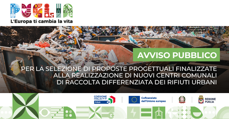 Con Determinazione del Dirigente della Sezione Ciclo Rifiuti e Bonifiche n. 323 del 11/12/2025 (pubblicata sul BURP n.4 del 15/01/2026) è stato approvato l’Avviso per la selezione di proposte progettuali finalizzate alla realizzazione di nuovi centri comunali di raccolta differenziata dei rifiuti urbani - ASSE II - Azione 2.10 – “Interventi per la gestione dei rifiuti urbani” del PR PUGLIA 2021-2027.