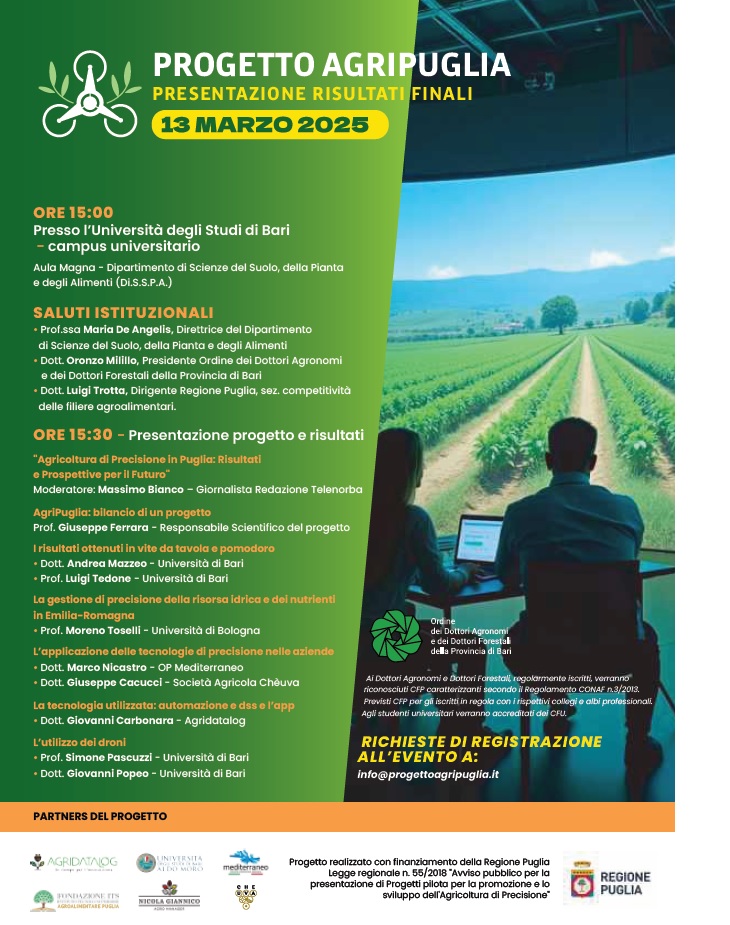 Domani, giovedì 13 marzo, si terrà presso l’Aula Magna del Dipartimento di Scienze del Suolo, della Pianta e degli Alimenti (DiSSPA) dell’Università di Bari l’evento conclusivo del Progetto AgriPuglia, iniziativa finanziata dalla Regione Puglia, dedicata all’innovazione e alla sostenibilità nell’agricoltura di precisione.