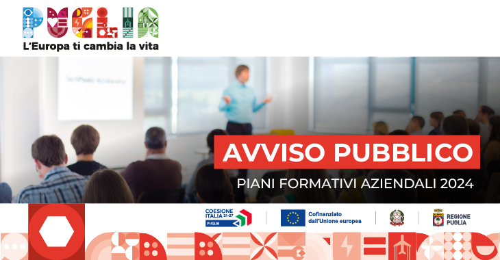Con Determinazione del Dirigente della Sezione Programmazione Unitaria 20 marzo 2025, n. 33 , pubblicata sul Bollettino Ufficiale della Regione Puglia n. 25 del 27 marzo 2025, è stato approvato Avviso Pubblico Piani Formativi Aziendali 2024, nell'ambito del Programma Regionale (PR) Puglia FESR-FSE+ - Priorità 5 "Occupazione", Azione 5.6 "Interventi per la formazione continua", con cui la Regione Puglia sostiene le imprese nell'investire in sviluppo delle competenze e aggiornamento professionale di lavoratrici e lavoratori .
