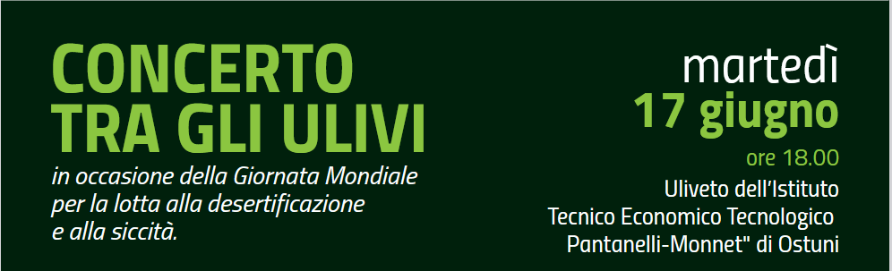Un Concerto tra gli ulivi ad Ostuni per celebrare la Giornata Mondiale per la lotta alla desertificazione e alla siccità. Si tratta dell’evento, in programma martedì 17 giugno 2025 dalle ore 18.00, organizzato Regione Puglia - Assessorato all’Ambiente, con la collaborazione del Parco delle Dune Costiere da Torre Canne a Torre San Leonardo, dell’Istituto Tecnico Economico Tecnologico "Pantanelli-Monnet" di Ostuni e con il patrocinio di Acquedotto Pugliese, della Provincia di Brindisi e del Comune di Ostuni.