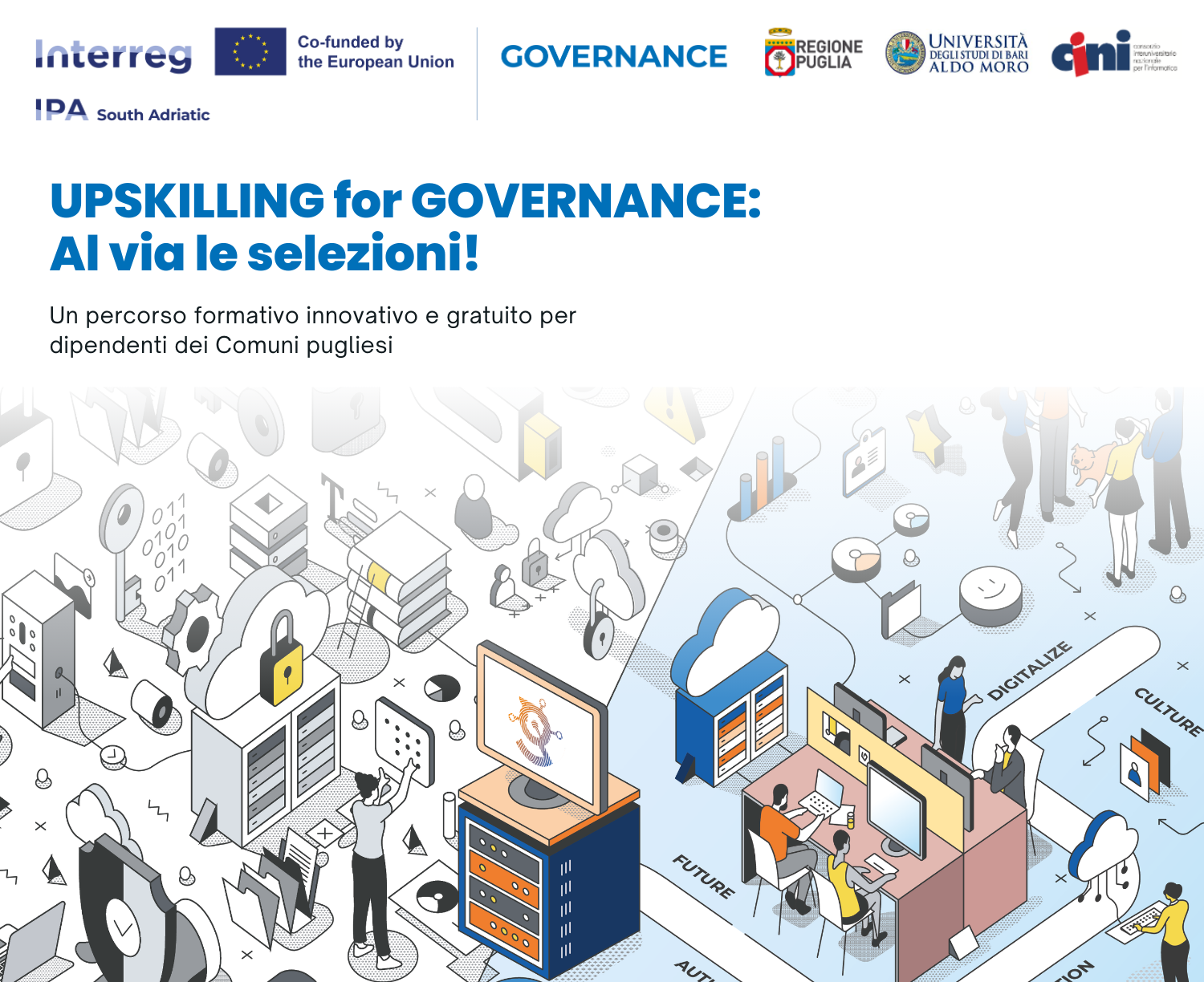 L’iniziativa prende forma all’interno del Progetto Interreg GOVERNANCE (Empowerment and simplification processes for a digital and well-governed South Adriatic), co-finanziato dal Programma Interreg IPA South Adriatic 2021-2027. Il corso è promosso dalla Regione Puglia, Capofila del progetto GOVERNANCE, in collaborazione con il Consorzio Interuniversitario Nazionale per l’Informatica (CINI), l’Università degli Studi di Bari Aldo Moro e ANCI Puglia, con l’obiettivo di fornire ai Dipendenti dei Comuni Pugliesi strumenti pratici per sostenere e promuovere la trasformazione digitale e la gestione efficiente dei processi amministrativi.