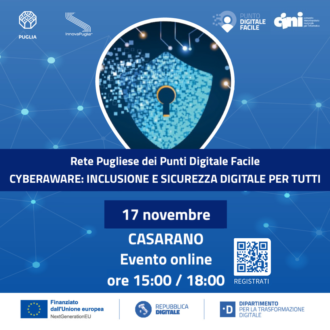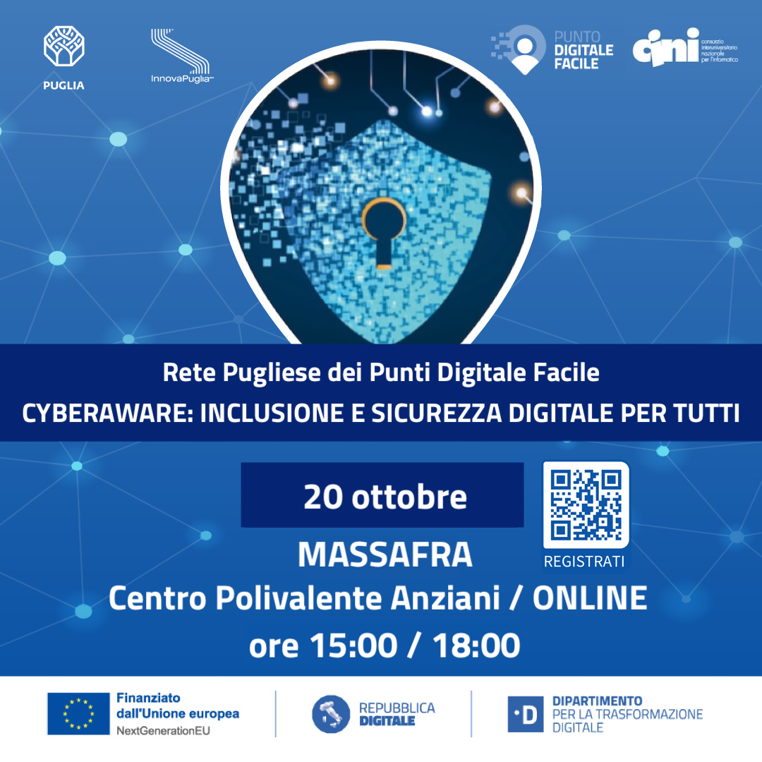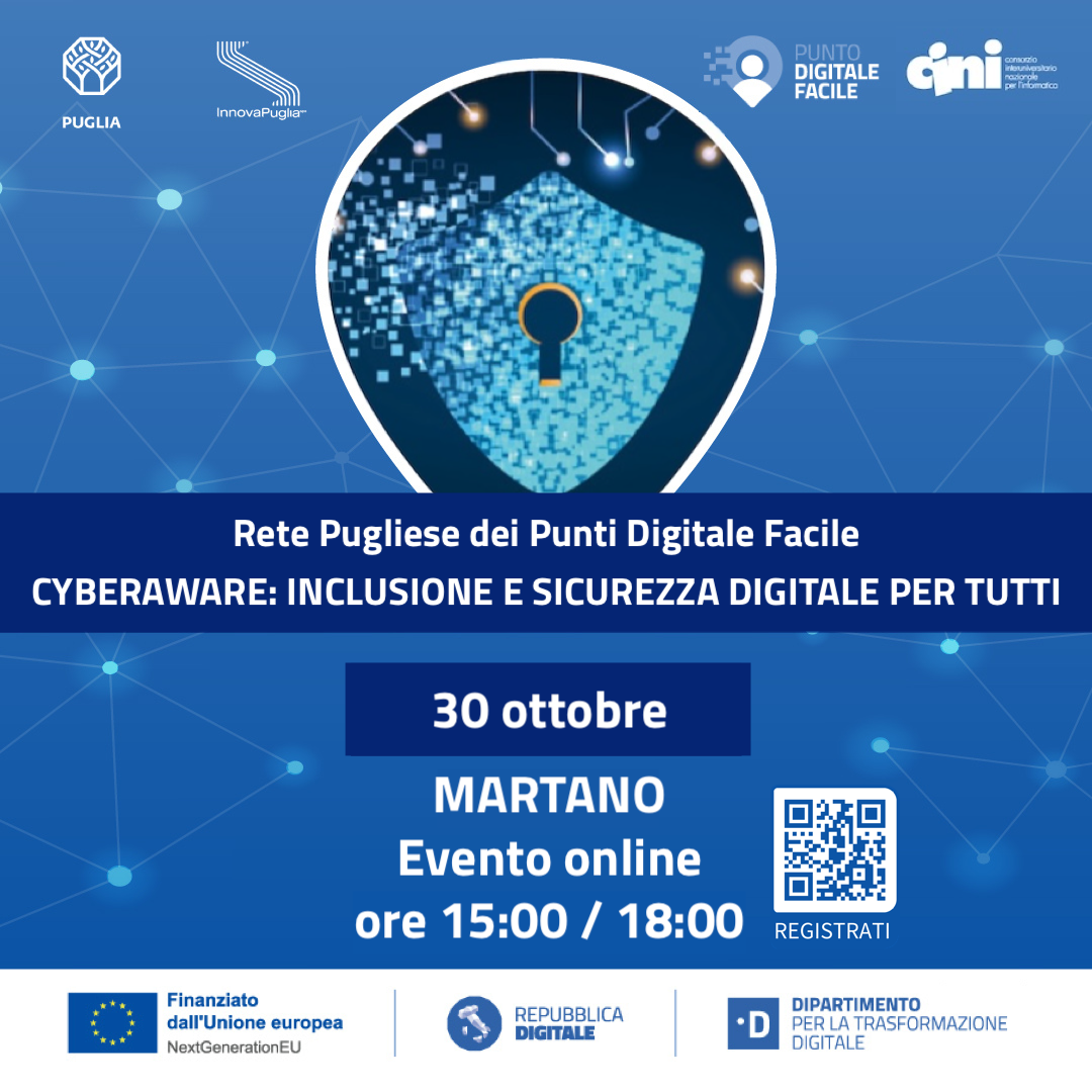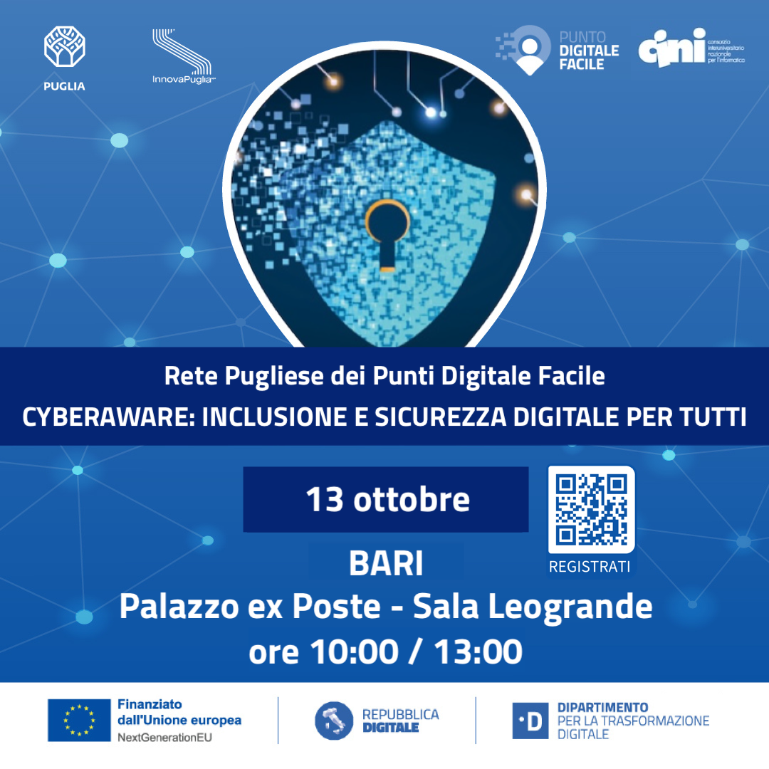 “CyberAware: Inclusione e Sicurezza Digitale per Tutti” è un'iniziativa prevista nell'ambito del progetto “Rete dei servizi di facilitazione digitale” promosso dal Dipartimento Sviluppo Economico della Regione Puglia con la collaborazione di InnovaPuglia SpA, finanziato con le risorse del PNRR - Investimento 1.7.2, nell’ambito del progetto nazionale del Dipartimento per la Trasformazione Digitale (DTD).
