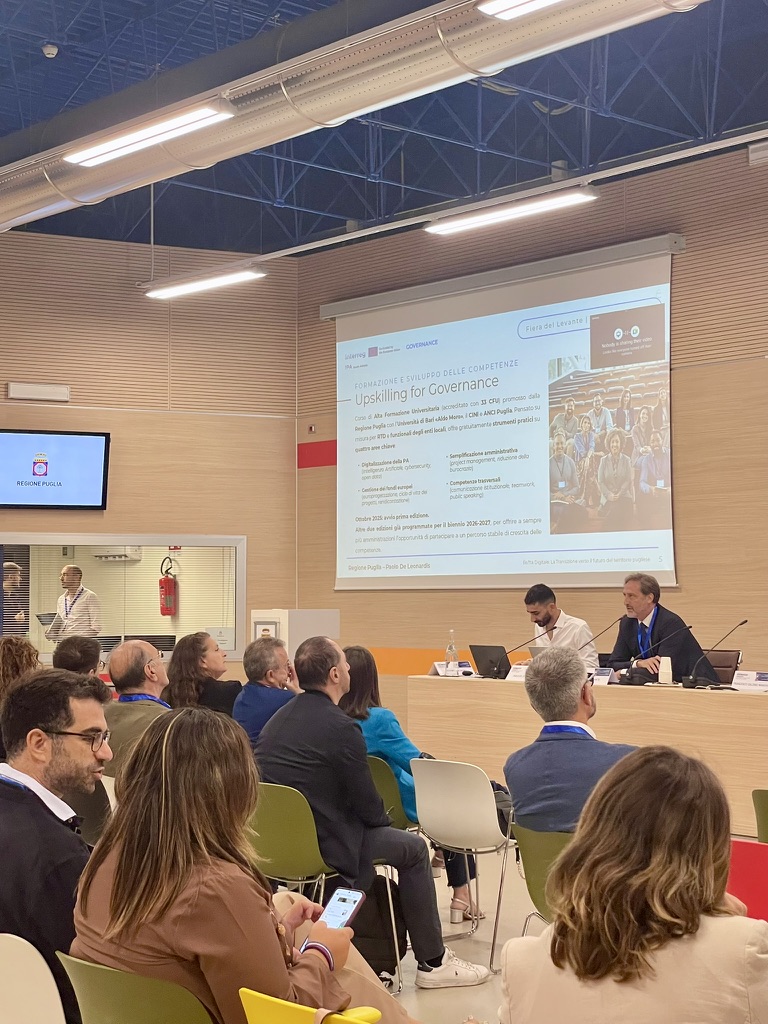 La Regione PugliaSezione Crescita digitale delle persone, del territorio e delle imprese del Dipartimento Sviluppo Economico, in collaborazione con il Dipartimento di Informatica dell’Università degli Studi di Bari “Aldo Moro”, il CINI-Consorzio Interuniversitario Nazionale per l’Informatica e ANCI Puglia, presenta UPSKILLING for GOVERNANCE, un corso di Alta Formazione rivolto ai dipendenti dei Comuni pugliesi. Il programma, incentrato su digitalizzazione, semplificazione amministrativa e gestione dei fondi europei, rappresenta un'opportunità concreta per rafforzare le competenze e migliorare l’efficienza della governance territoriale.